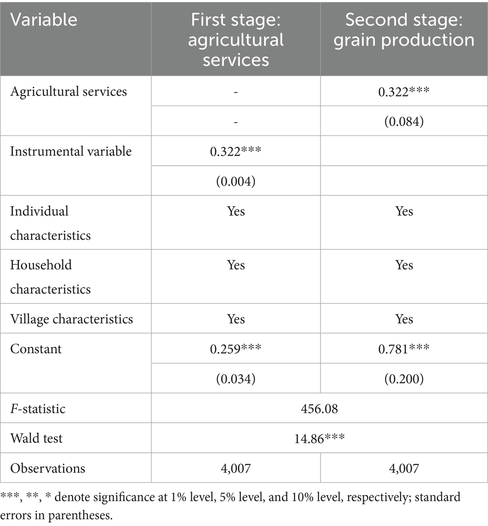 To address potential endogeneity concerns, we also used the IV-probit model to examine the effect of agricultural services on grain production. The instrumental variable must be strongly correlated with the adoption of agricultural services but must not directly influence the household’s grain production. Consequently, the average number of agricultural services adopted by other farmers in the village was selected as the instrumental variable. A household’s decision to adopt the agricultural services is likely to be affected by the agricultural services adopt status of their neighbors. But the mimicry on agricultural services is less likely to directly influence the household’s decision to plant cash crops or grain crops. As shown in Table 8, the first stage F-statistic was 456.08, well above the critical value of 10, thereby rejecting the hypothesis of weak instruments and confirming that selected instrumental variable effectively addressed endogeneity concerns. Additionally, the IV-Probit model successfully passed the Wald test, indicating that the instrumental variable was valid and the parameter estimates were reliable. The second-stage results showed that the coefficient for the effect of agricultural services on grain production was 0.322 (significant at the 1% level). This finding supported the argument that agricultural services contribute to grain production, thereby confirming the robustness of the study’s conclusions.