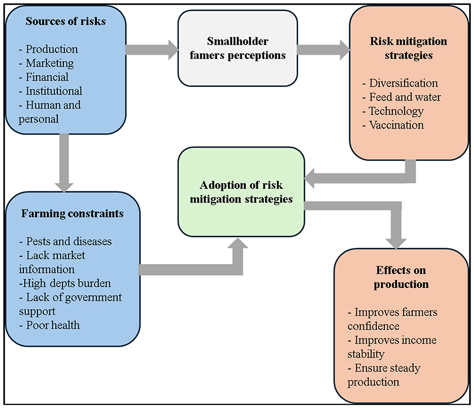 This study employed a conceptual framework to generalize the link between its different factors. A conceptual framework is essentially a structured way of organizing ideas, theories, assumptions, and expectations that guide a study (Aliu et al., 2021). It can take the form of a written explanation or a visual diagram that highlights the main concepts, variables, and how they are thought to be connected. In this study, the conceptual diagram presented in Figure 1 depicts the link between the main concepts of this study, which are sources of risks, farming constraints, smallholder farmer perceptions, adoption of mitigation strategies, and the effects it has on production. Smallholder farmers' perceptions are driven by various sources of risks that come with various farming constraints. In this case, farmer perceptions rely on the impact of these constraints in all stages of the farming sector. For instance, in the production stage, farmers may face livestock production failure due to a lack of knowledge, essential farming resources, and the outbreak of livestock diseases. The experience of facing such constraints will drive smallholder farmers to come up with management strategies to reduce the vulnerability to risks. Some of the mitigation strategies may include farm diversification, the use of vaccines to treat diseases, as employing intensive and semi-intensive practices. The adoption of various risk mitigation strategies could yield better returns for smallholder farmers. In that way, their production will be high, which will generate their income and promote household consumption (meat, milk, and eggs). Therefore, smallholder farmer livelihoods can be sustained and improved.