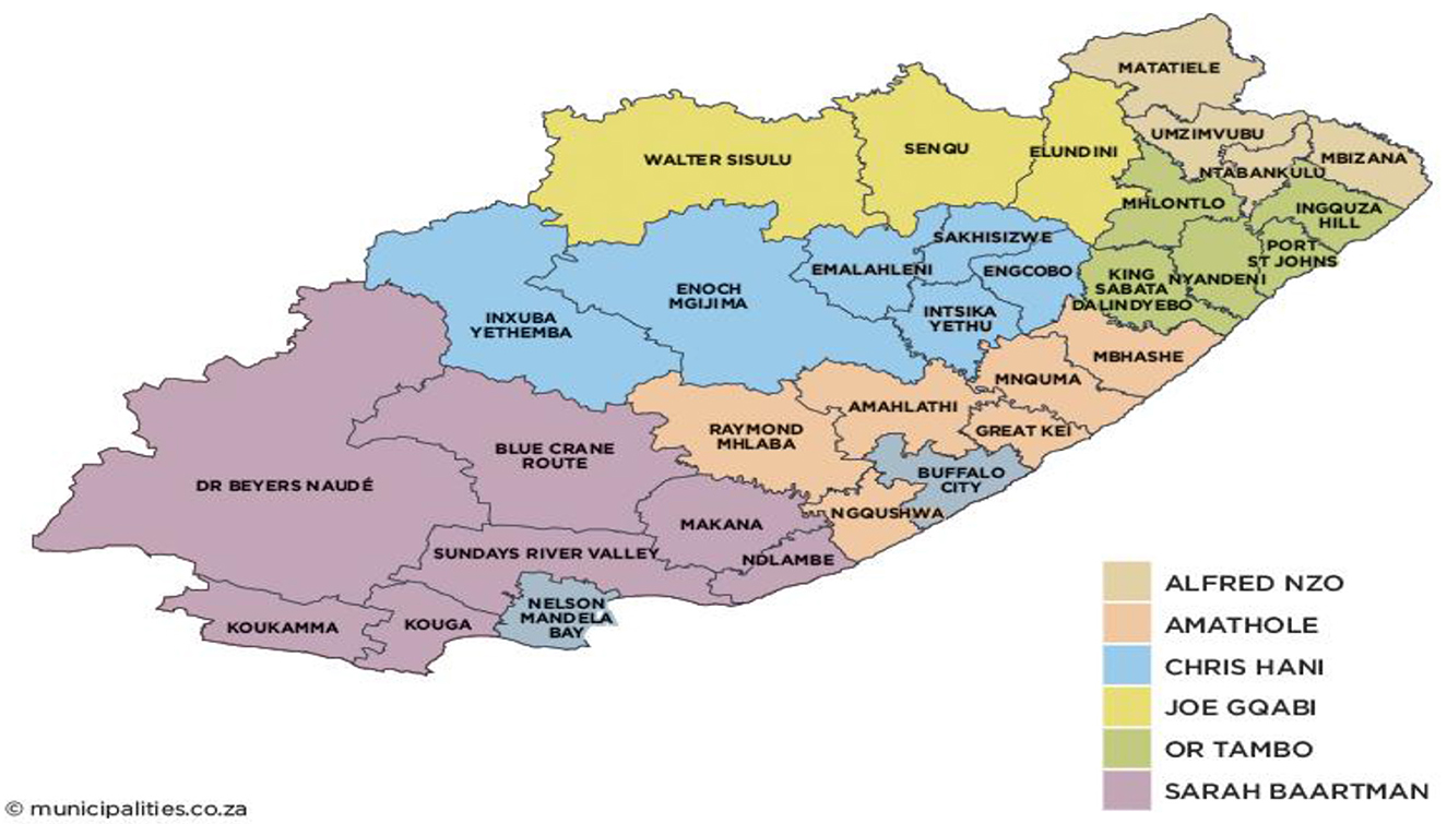 The study was conducted in the Eastern Cape Province (ECP) in South Africa. The ECP is one of the largest provinces (first being Northern Cape Province, then ECP) and is located in the south-central part of South Africa. ECP has 168,966 km2, which makes the province the second largest after the Northern Cape Province of South Africa. The province combined areas from the former Xhosa homelands of the Transkei and Ciskei, together with what was previously part of the Cape Province. The province is dominated by Xhosa tribes (which include AmaMpondo, AbaThembu, AmaMpondomise, AmaHlubi, AmaBhaca, AmaXesibe, AmaBomvana). The population of Eastern Cape Province is 7,230,000, of whom 86.3% are Black, 8.3% are Coloreds, 4.7% are White, and 0.4% are Indian/Asian.
