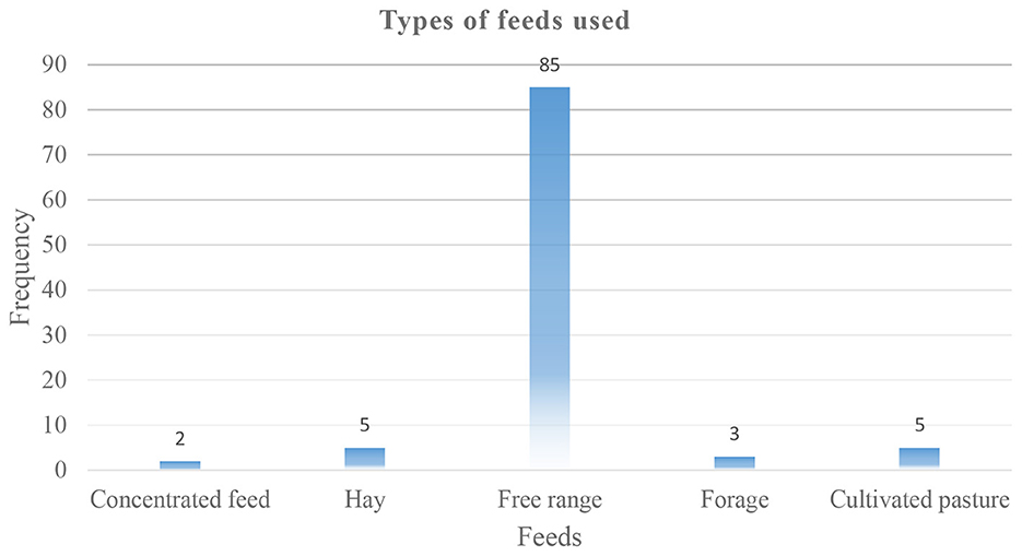 Smallholder farmers use different feeds to cater to their livestock. Figure 3 illustrates the feeding practices among farmers, showing a prevalent reliance on free-range grazing (85%), with minimal adoption of cultivated pasture (5%), hay (5%), forage (3%), and concentrated feed (2%). This distribution emphasizes a dependence on extensive grazing systems, a characteristic feature of smallholder livestock farming in Southern Africa. The preference for free-range systems is often attributed to their low input requirements and alignment with traditional farming practices (Bist et al., 2024). However, such systems are increasingly vulnerable to climatic variabilities, including prolonged droughts and erratic rainfall patterns, which adversely affect pasture availability and quality. The limited use of cultivated pastures and hay suggests constraints such as inadequate access to land, resources, and knowledge necessary for establishing and managing these feed resources (Alimi et al., 2024). Moreover, the minimal adoption of concentrated feeds may be due to their cost implications and limited availability in rural areas.