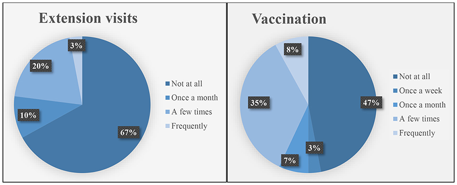 Extension visits and vaccination are the important aspects that each farmer needs to have access to. These elements assist in the upholding of the overall production. Extension visits ensure training and accumulation of more information whereas vaccination ensures that the livestock can withstand diseases and other effects associated with seasonal variations. Figure 4 illustrates the rate of these factors in terms of how much time smallholder farmers receive the visits and the frequency of vaccination for livestock.