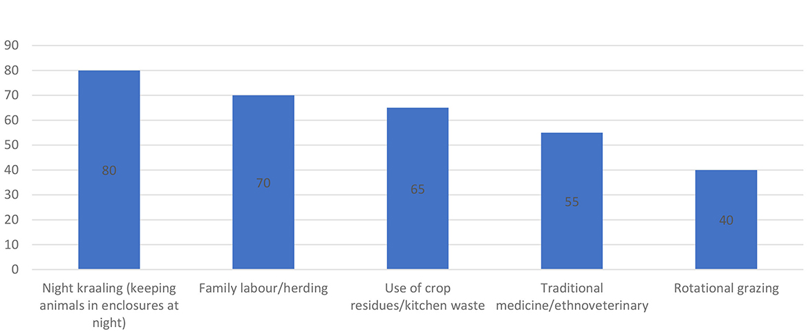 The findings indicate that smallholder farmers in the Eastern Cape continue to rely heavily on indigenous, home-based livestock management practices to sustain their herds. Night kraaling is the most dominant practice, with 80% of respondents enclosing animals overnight as a measure to prevent theft and predation. Family labor and herding remain central to livestock management, with 70% of farmers depending on household members rather than hired labor, which reflects both cost-saving strategies and cultural traditions. The use of crop residues and kitchen waste was reported by 65% of farmers, highlighting the integration of livestock and crop production systems to maximize resource use. Over half of the farmers (55%) rely on traditional medicine and ethnoveterinary practices for disease prevention and treatment, largely due to limited access to formal veterinary services. Meanwhile, 40% practice rotational grazing, an indigenous method that helps preserve pasture and reduce overgrazing. Collectively, these practices demonstrate the resilience and adaptive strategies of smallholder farmers, but they also underscore the need for complementary modern interventions to enhance productivity and reduce risks.