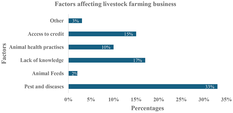 Figure 6 presents insights into the key factors perceived by respondents as making their farming businesses risky. Particularly, pests and diseases emerged as the most significant threat, mentioned by 33% of the surveyed farmers. This aligns with broader findings in the literature, which identify livestock diseases as a major constraint to productivity and profitability, particularly among smallholder farmers in Sub-Saharan Africa (Kimeli et al., 2025). Disease outbreaks, such as foot-and-mouth disease or brucellosis, often lead to severe economic losses, reduced animal productivity, and restricted market access.