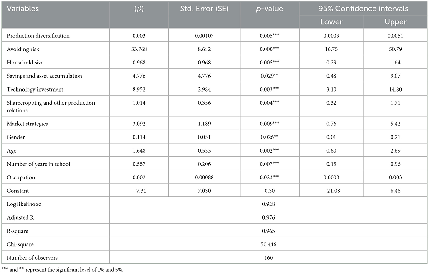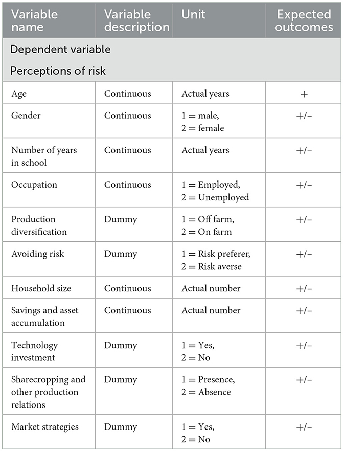 Where, Yi—dependent variable (risk experienced by livestock farmers), Pi—the probability of a farmer experiencing risk, 1–Pi—the probability of a farmer not experiencing risk, β0–intercept, β1 − βn–parameter coefficients, X1−Xn–explanatory variables and, μi–the disturbance terms. During analysis, the model employed multiple tests to strengthen the results. These tests include the Log Likelihood test and the Chi-square to check how well the model fits the data and whether the predictors are meaningful. Measures like R-squared and Adjusted R-squared help explain how much of the outcome the model can predict. When used in conjunction, these statistics give a clear picture of the reliability and strength of the model's results. Table 1 describes regression variables, unit types, and expected outcomes.