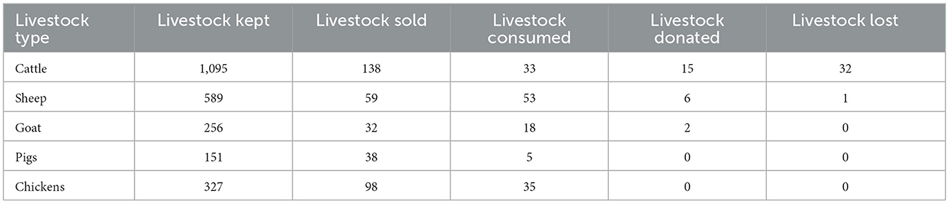 This study looked at the patterns of livestock ownership, use, and losses among farming households, focusing on five major livestock types: cattle, sheep, goats, pigs, and chickens. The findings reveal a clear trend in the multifunctional role of livestock, with most animals being retained rather than sold, consumed, donated, or lost. These findings are outlined in Table 2.