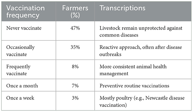 The results are presented in Table 4 reveal a worrying trend in vaccination uptake among smallholder livestock farmers in the Eastern Cape. Nearly half of the farmers (47%) reported that they had never vaccinated their livestock. This lack of preventive health care leaves animals highly vulnerable to recurring and preventable diseases such as foot-and-mouth disease, brucellosis, and Newcastle disease. The absence of vaccination also reflects structural challenges faced by smallholders, including poor access to veterinary services, limited extension support, and high costs of vaccines. Another 35% of farmers indicated that they only vaccinate occasionally, often in response to disease outbreaks rather than as a preventive measure. This reactive approach indicates that farmers are not benefiting from the full protective potential of vaccination, which requires consistent and scheduled application. In contrast, only 8% of farmers were vaccinated frequently, while 7% followed a monthly vaccination routine, and 3% maintained a weekly schedule. These minority groups demonstrate an awareness of the importance of regular vaccination and better integration of animal health into farm management. However, their small share highlights the broader systemic failure in ensuring effective disease prevention in rural livestock systems. Overall, the findings illustrate that vaccination practices are irregular and insufficient, undermining livestock health, productivity, and the resilience of smallholder farming households.