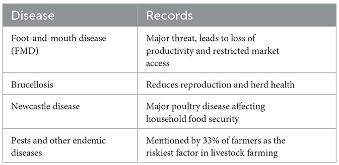 Table 5 highlights the most common livestock diseases affecting smallholder farmers in the study area, with foot-and-mouth disease (FMD), brucellosis, and Newcastle disease identified as the most pressing concerns. FMD is a highly contagious disease that causes significant production losses, reduced weight gain, and market restrictions, making it particularly devastating in rural communities where cattle serve as both an economic and social asset. Brucellosis, another major disease, undermines herd fertility, causes abortions, and reduces milk production, thereby threatening both food security and income generation. Newcastle disease is a leading cause of mortality in poultry flocks and directly impacts household nutrition and small-scale poultry trade. In addition to these, farmers reported the presence of pests and other endemic livestock diseases, with 33% of respondents identifying them as the riskiest factor in livestock production. This finding reinforces the notion that livestock health challenges remain central to the vulnerability of smallholder farmers. The presence of these diseases further underscores the importance of consistent vaccination programs, biosecurity measures, and improved extension services. Without effective control, such diseases perpetuate a cycle of economic losses, reduced household resilience, and limited market participation, keeping smallholder farmers in a state of persistent vulnerability.