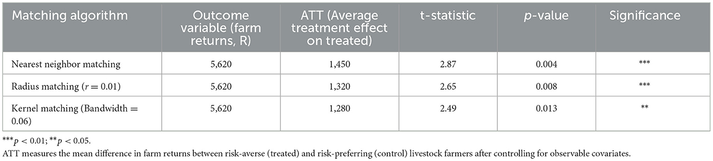 The study adopted the propensity score matching to estimate the impact of risk behavior on smallholder livestock farmers. This is the most used analytical tool for impact studies, and studies such as Mdoda et al. (2025) made use of this analytical tool. PSM is a useful tool to account for the disparity in covariates between treated and comparison groups. Specifically, the study used the Average Treatment Effect on the Treated (ATT) to measure the impact, which is the average difference between expected outcome values with and without treatment for those who had experienced risk in their livestock farming (Khumalo et al., 2025; Mdoda et al., 2025). A propensity is a semi-parametric method that gives an estimate of agricultural credit access, as assumed by the binary logit regression model. The PSM uses propensity scores to match every individual observation of a treated livestock farmer with an observation with similar characteristics from the non-treated or control group. Propensity score matching estimation relies on two important assumptions, namely, the conditional independence and overlap assumptions. The conditional independence assumption, Chappa et al. (2024) states that the treatment assignment is essentially randomized when we condition on a rich set of covariates. It recommends that systematic differences in outcomes between treated and comparison livestock farmers with the same values for covariates are attributable to treatment. The CIA assumption cannot be tested and only relies on conditioning on a rich set of observed covariates. The overlap assumption, on the other hand, states that by conditioning on a set of covariates, everyone has a positive probability of receiving treatment (also known as the overlap assumption). The propensity score is the conditional probability of the task given the treatment, given a vector of observed covariates. The PSM model was expressed as follows: