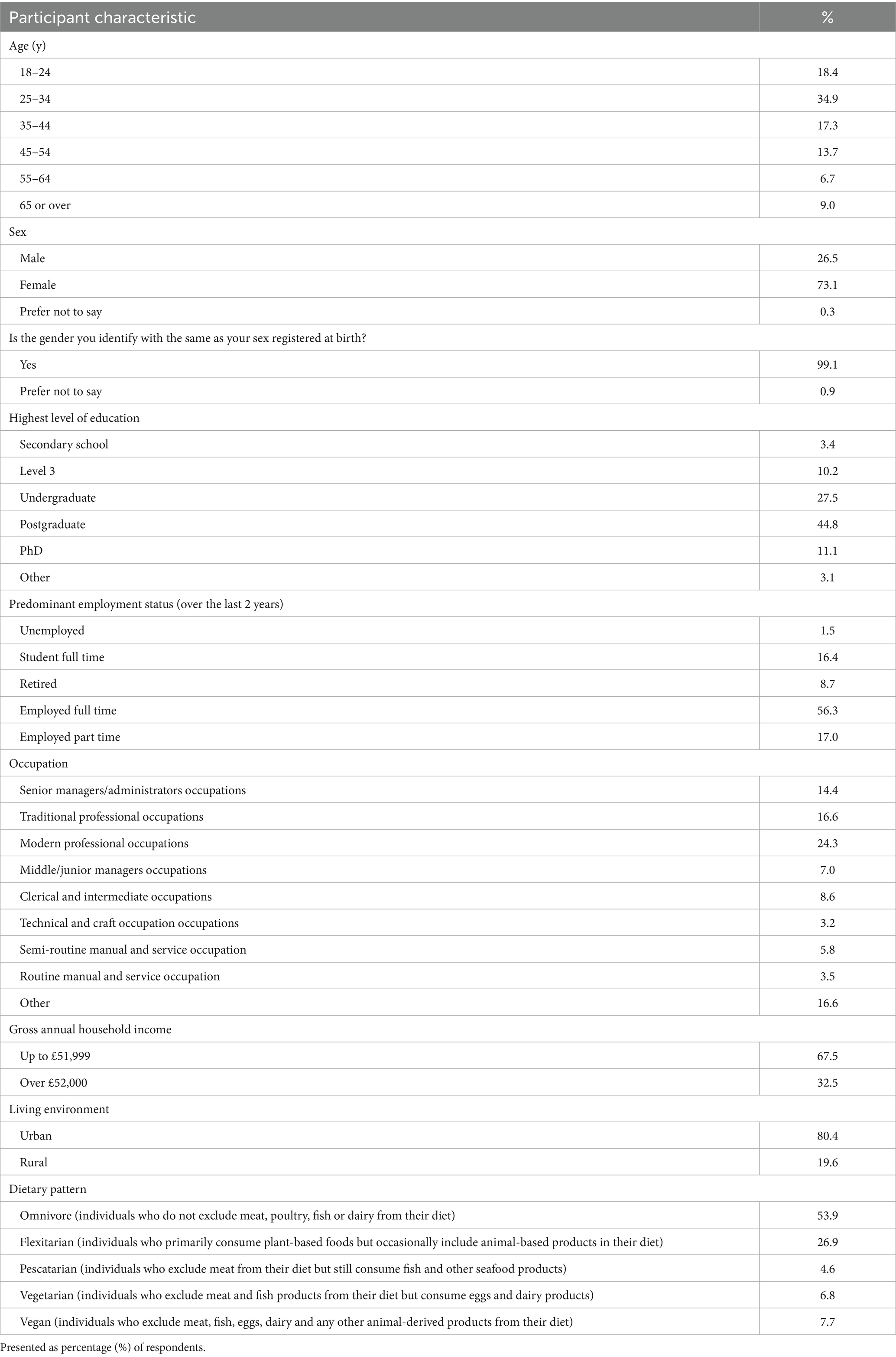 UK adults, aged 18 or older, were recruited via physical and electronic poster, social media platforms, virtual learning environment messaging to students at Sheffield Hallam University and other convenience sampling methods. Respondents were invited to complete an online questionnaire, distributed via Qualtrics (Qualtrics, Provo, UT) to facilitate data collection across a larger geographical location. Published literature and validated tools informed the design of the study questionnaire (Clark and Bogdan, 2019; Food Standards Agency, 2022; Goldsmith and Hofacker, 1991; Knaapila et al., 2022; Estell et al., 2021; Onwezen et al., 2019). The initial questionnaire was pre-tested with a small sample (n = 10) and feedback was gathered regarding the participants’ ability to understand and interpret the questions as intended. Small adjustments were then made (e.g., refinement of wording) before the final questionnaire was distributed to ensure clarity and promote validity (see Supplementary material S1). Data collection was conducted between June 2022 and September 2023. A total of 454 eligible participants attempted the questionnaire. The data were cleaned for obvious errors and any biologically implausible and contradictory data were removed. From the 447 remaining responses, 325 were deemed valid for analysis based on participants answering any question beyond the demographic information section of the questionnaire. This sample size is comparable with that used within similar studies (Clark and Bogdan, 2019; Culliford and Bradbury, 2020; Lea et al., 2006). Table 1 presents an overview of participant characteristics.