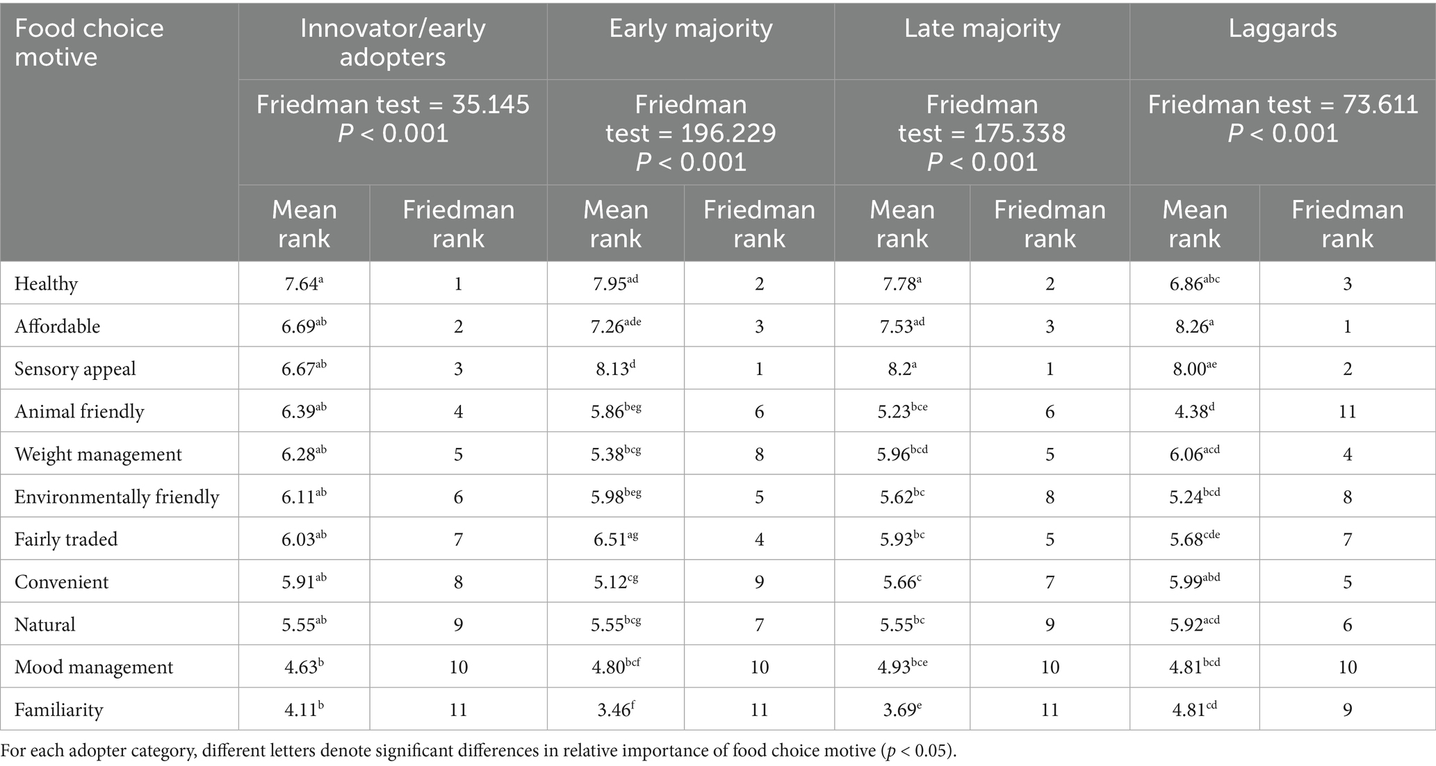 Figure 6 presents the mean scores for each FCM among the adopter categories to exemplify variation in the degree of importance assigned to each motive. A Kruskal-Wallis test was conducted to determine whether factors driving individual food choice were significantly different across the subgroups.
