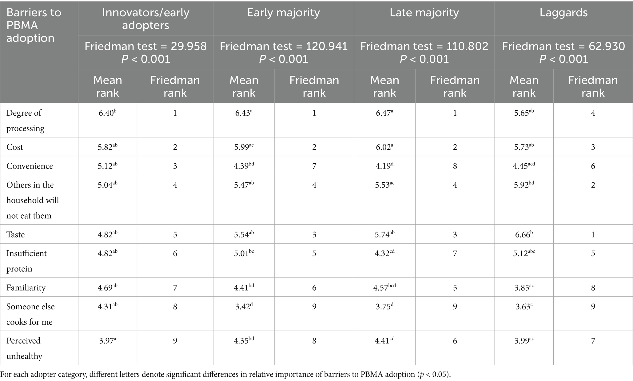Friedman Rank tests with Dunn-Bonferroni post hoc tests demonstrated significant differences regarding the degree to which specific factors were perceived as barriers to the adoption of PBMAs within the Roger’s adopter subgroups. Table 3 highlights variation in the ranking of barriers influencing the adoption of PBMAs. Similar to FCM, the Early Majority and Late Majority subgroups ranked the top three barriers (degree of processing, cost, and taste) in the same order. Post hoc tests highlighted that degree of processing was perceived to be a significantly greater barrier versus convenience, insufficient protein, perceived unhealthy, and having someone else cook (all p < 0.05). Innovators/Early Adopters also ranked degree of processing the greatest barrier to PBMA adoption [ranked significantly higher than perceived unhealthy (p = 0.009)]. While Laggards identified taste to be the key barrier to the adoption of PBMAs [ranked significantly higher than familiarity, perceived unhealthy, convenience and having someone else cook (all p < 0.05)]. Notably, having someone else cook received a low ranking within all adopter subgroups.