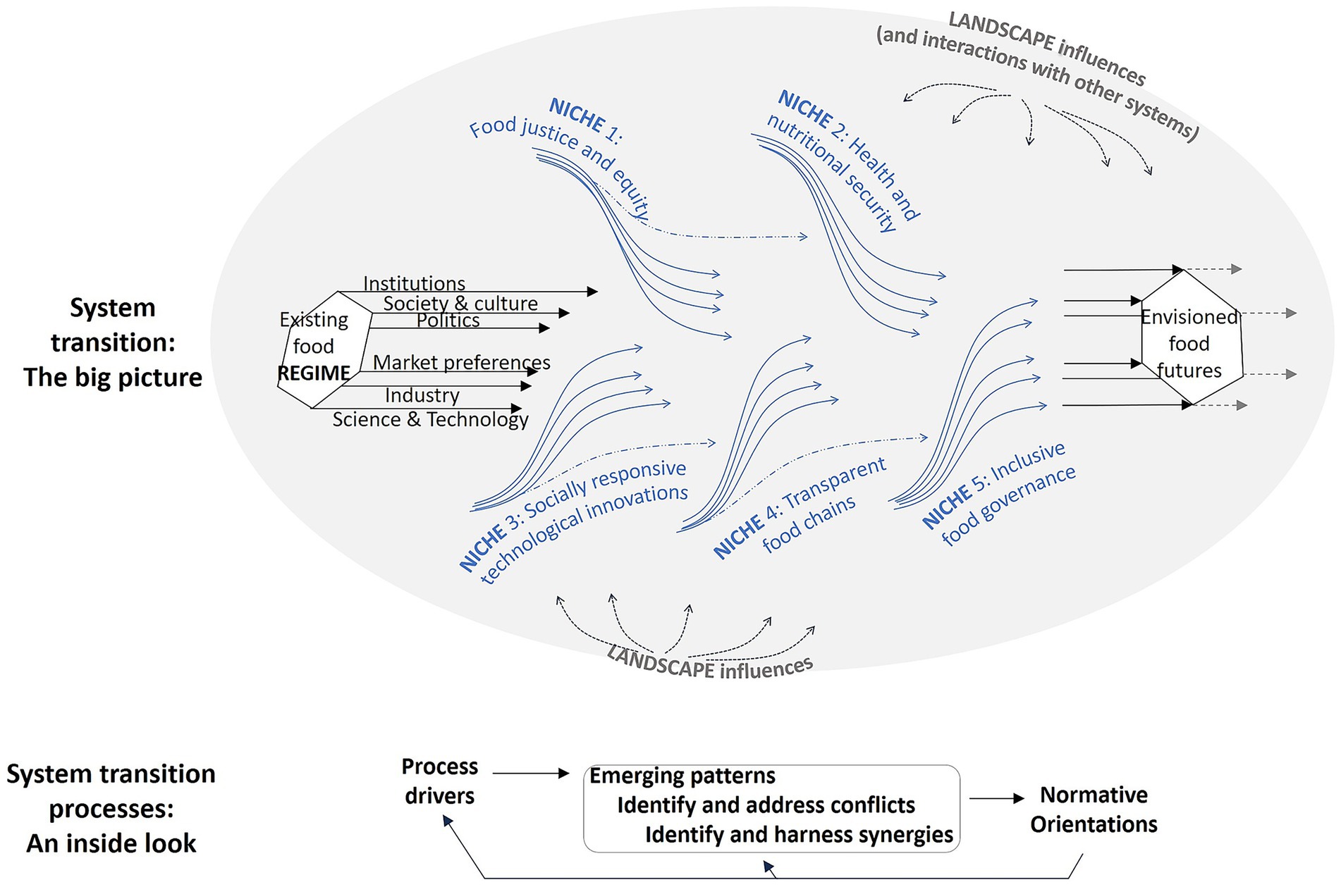 The multi-level perspective (MLP) (Geels, 2002, 2011, 2019) is an influential framework for processes (technological, institutional, networks and practices) of regime change in society, explaining the interactions within and across three analytical levels of “landscape,” “regime” and “niches.” In agri-food system transition research, the MLP is the most prominent transition framework by far (El Bilali, 2018). In food systems, niche-innovations may be technologically driven such as engineered high-yielding seeds, digital agriculture, ultra-processed foods, or alternative proteins; it may also be idea- or practice-driven such as organic farming, agroecology or urban agriculture. Gaitán-Cremaschi et al. (2018) differentiate the incremental and mainly technologically-driven innovations that feed the existing productivism paradigm, and the arguably more norm- and practice-driven innovations such as biodiversity-based agriculture or alternative food networks that potentially bring about more radical sustainability transitions. El Bilali (2019) suggests that the MLP may be more adept in technical-driven innovations rather than social innovations processes in the food system. Besides, while focusing on niches (thus innovation-driven transitions), MLP studies tend to overlook the landscape dimension and under-describe the regime as well as transition impacts (El Bilali, 2019).