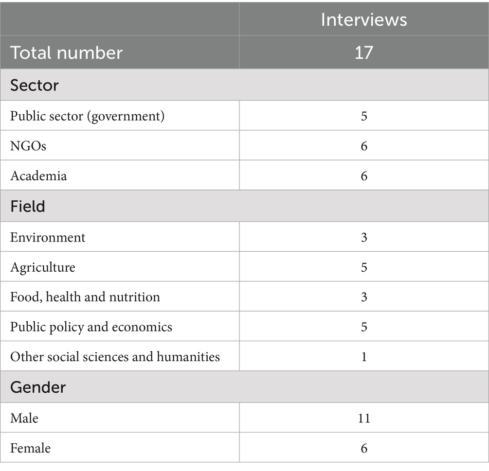 This paper presents the findings from in-depth interviews (n = 17) of food and agriculture researchers and practitioners in Israel. Table 1 shows the breakdown of the sectors and fields the respondents came from. This is part of a larger study comprising an online survey (n = 50) (Soh et al., 2024). also targeting Israeli food and agriculture experts.