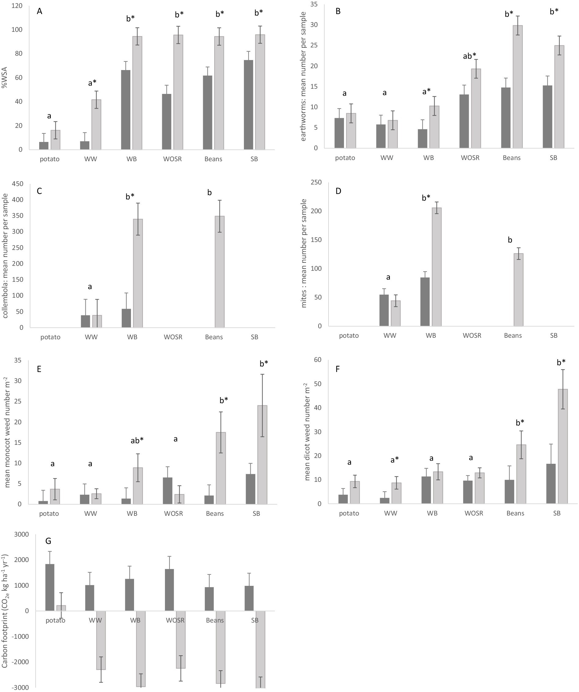 Figure 4. Differences in indicators of soil structure and biodiversity between treatments over the crop rotation: aggregate stability (A), abundance of earthworms (B), Collembola (C) and mites (D), and densities of monocot (E), dicot (F) weeds and (G) carbon footprint. Conventional treatment (dark shaded bars); Integrated treatment (light shaded bars). Crop rotation: yr. 1 potato, yr. 2 winter wheat (WW), yr. 3 winter barley (WB), yr. 4 winter oilseed (WOSR), yr. 5 faba beans and yr. 6 spring barley (SB). Data are back transformed mean values per sample (with standard errors). * = significant treatment differences. Letters denote significant differences between crops (p < 0.005).