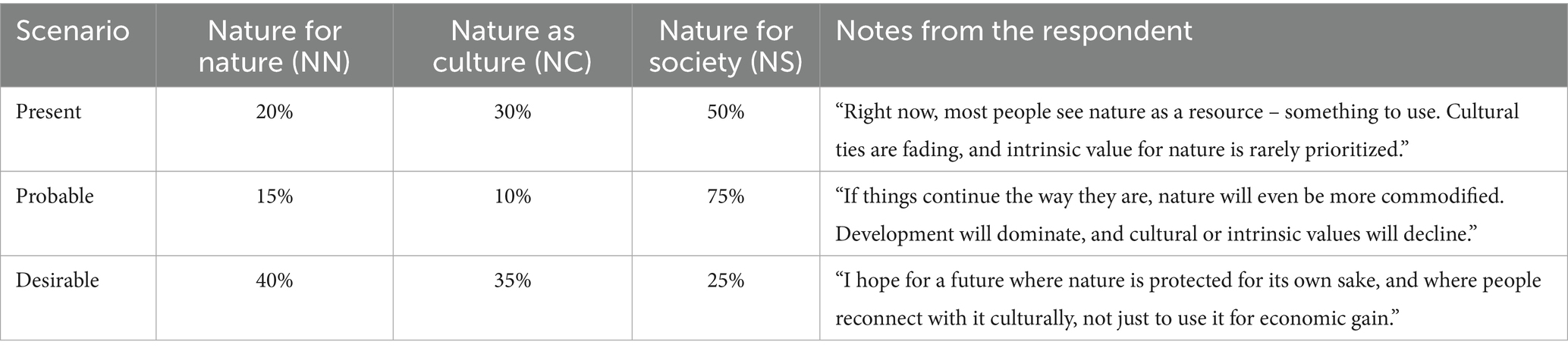 We designed the semi-structured questions based on the three dimensions of the NFF, which were informed by the value assessment methodology developed by IPBES (IPBES, 2022). Before administering the questions (quantitative valuing) and conducting participatory workshops (qualitative valuing), we ensured that the respondents clearly understood the NC, NN, and NS dimensions of the NFF and how we intended to use it to gain divergent valuations of nature and plural visions of human-nature relationships. Consequently, respondents completed the survey assessing their perceptions of nature [use of their natural ecosystems and biodiversity (NS), their cultural interconnectedness with them (NC), and their autonomy or right to exist, evolve, and function independently without human interference (NN)] across three temporal scenarios: the present, a probable future, and a desirable future. For each scenario, they assigned percentage values reflecting their perceived value of nature concerning the NN, NC, and NS categories. In each scenario, the sum of these values adds up to 100% (Table 1 below).