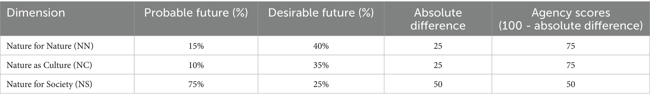 The quantitative data collected during the research were systematically organized in a Microsoft Excel table format to support further analysis. We used R software (version 4.3.3) and relevant packages such as dplyr (Wickham, 2017) for data cleaning and lm (R Core Team, 2024) to assess the statistical relationship of the various variables. To assess the respondents’ perceived agency in shaping future human-nature relationships, we operationalized agency as the alignment between their probable and desirable futures. Specifically, we calculated the absolute difference between each respondent’s valuation of a probable future and their valuation for a desirable future (using the data collected as in Table 1) across the three dimensions of the Nature Futures Framework (NN, NC, and NS). This difference reflects the perceived gap between expectation and aspiration (see Table 2). To derive a standardized measure of agency, we subtracted the absolute difference from 100% such that higher scores indicate greater perceived agency – i.e., a stronger belief that the future one desires is attainable.
