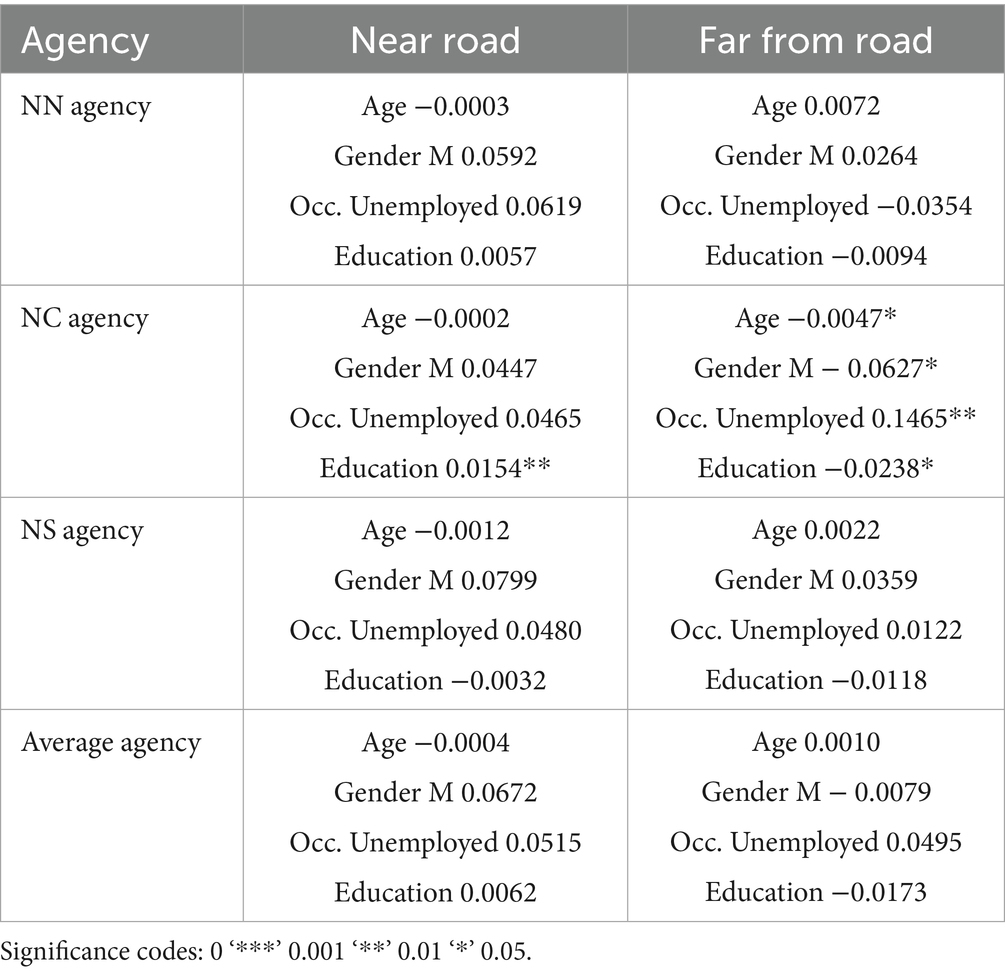Table 3 presents the coefficients of marginal effects of the demographic and contextual predictors on perceived agency scores across NN, NC, and NS, as well as the average agency score. Based on the sub-sample analysis, the first column represents respondents living near roads, while the second column is for those living far away from the road. The statistical significance for each coefficient is based on the original log-odds estimation, rather than the marginal effects coefficients shown in the table. We preferred showing the marginal effects coefficients to log-odds due to ease of interpretation.