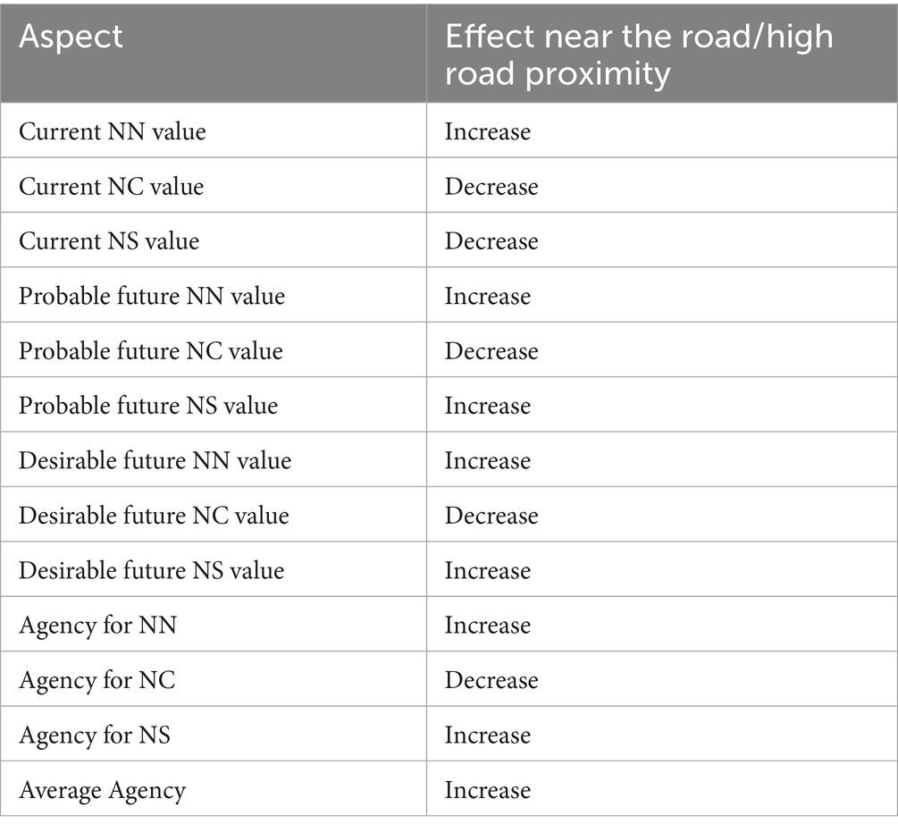 Table 5 shows a general pattern of decrease in NC and increase in NS and NN with reduced distance from the road. Specifically, the current value of NN was seen to increase near roads, while the values for NC and NS were perceived to decrease in the future. Perceptions of probable futures suggest continued increases in NN and NS values, but a further decrease in NC. Desirable futures mirrored these patterns, indicating a preference for increased NN and NS values and a continued decline in NC.