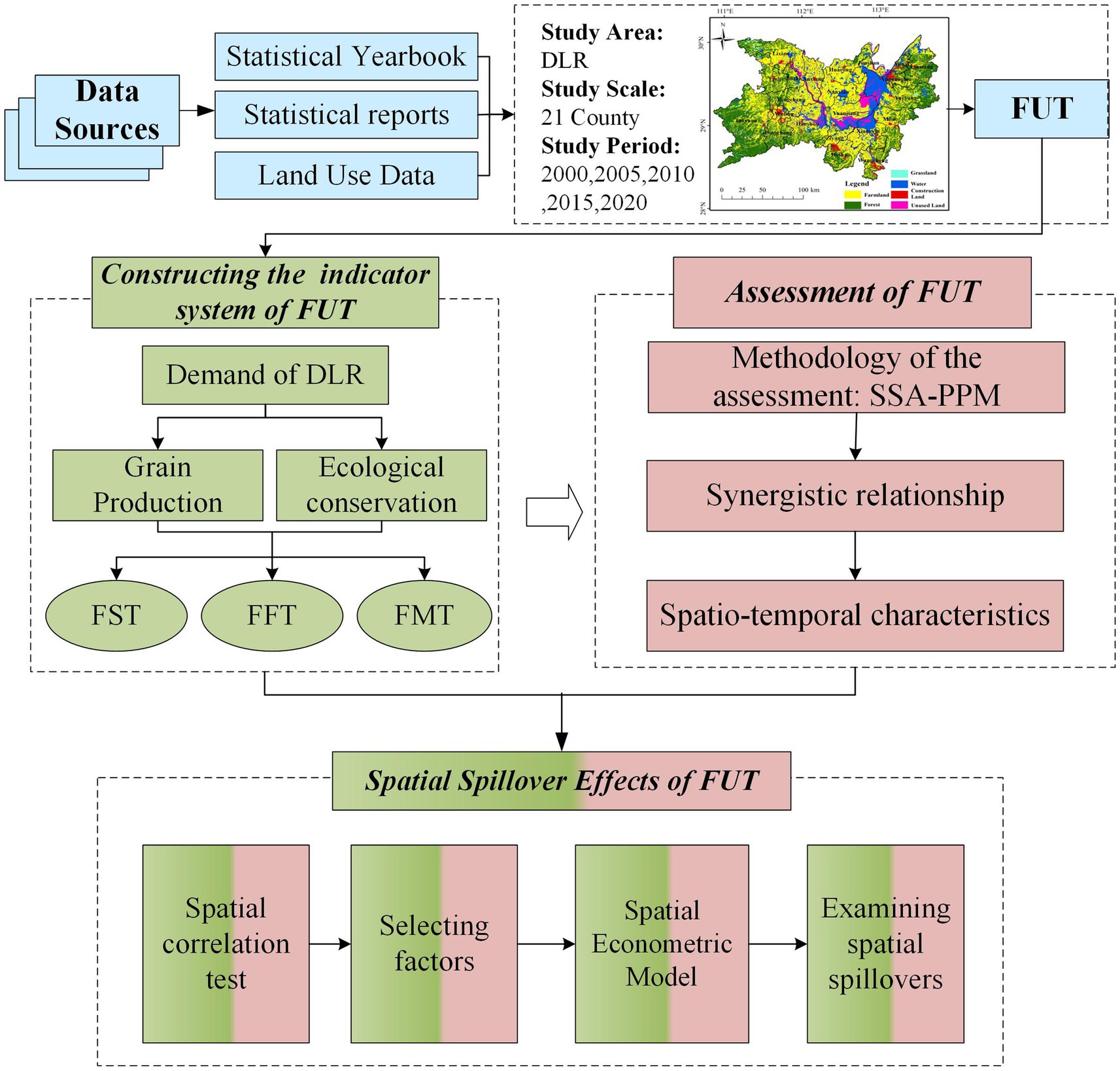 Further research is necessary to gain a deeper understanding of FUT. Firstly, the expansion of the number of factors included in the FUT has rendered existing methodologies incapable of fully utilizing the data or accessing the internal linkages and structural features of high-dimensional indicators. Secondly, the research of DLR’s FUT did not fully incorporate dominant morphology transition and recessive morphology transition into its analytical framework, the synergistic relationship between morphologies have also not been explored in previous research. Finally, it is essential to examine the spatial spillover effect of the FUT, as demanded by the spatial correlation of farmland use. Hence, this paper will reveal the underlying meaning of DLR’s FUT and employs SSA-PPM to quantitative assessment. The spatiotemporal evolution of FUT from 2000 to 2020 is also analyzed, followed by investigation of the synergistic relationship and spatial spillover effect. This paper holds immense theoretical significance in facilitating a profound understanding of FUT, and it offers a solid reference to enhance the spatial coherence of DLR’s land use. The technological route for this paper is shown in Figure 1.