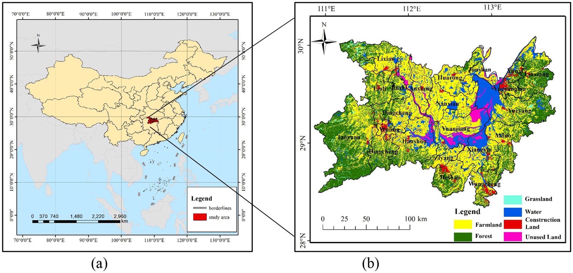Located in the northeast region of Hunan Province, China, DLR is composed of 21 county-level units (Figures 2a,b). By the end of 2020, the farmland area in the DLR was 14,280.81 square kilometers, with the ratio of farmland accounting for about 45.84%. The floods that occurred in 1998 prompted the Chinese Government to implement the policy of returning farmland to wetland, aiming to maintain the synergy between grain production and ecological conservation in the DLR. Meanwhile, with the expansion of farmland and the intensification of agriculture, the ecological environment of the DLR faces tremendous pressure. Land degradation, water pollution, loss of biodiversity caused by over-cultivation and the misuse of chemical fertilizers have created a pressing need for ecological restoration. Guided by the policy of returning farmland to wetland, FUT is reshaping the relationship between people and nature in the DLR. Therefore, this paper takes DLR as the study area.
