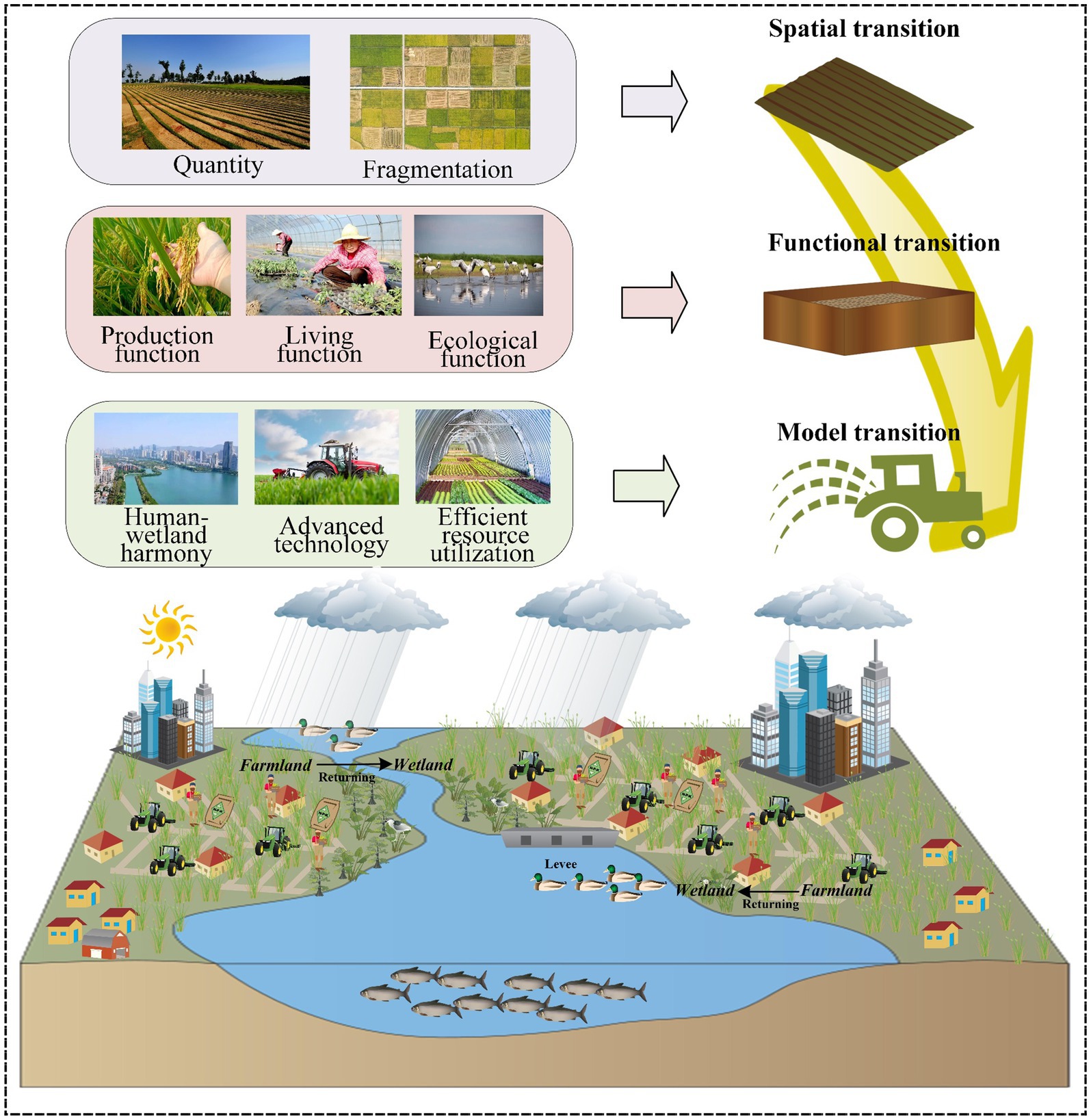 (1) Human-wetland harmony. Human-wetland harmony is central to the model transition, as it ensures the ecological sustainability and agricultural productivity (Yang et al., 2020; Long et al., 2022). When the expansion of farmland substantially hinders the ecological functions of the wetland, the government intervenes by implementing the policy of returning farmland to wetland. To prevent flooding caused by seasonal changes in the water level of Dongting Lake, the construction of levee and other engineering safeguards is vital during the FUT process, ensuring both ecological and agricultural stability.