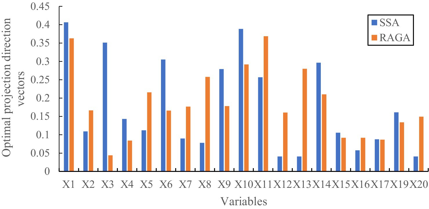 SSA-PPM is used to calculate the FUT levels. We also compare the results with those obtained using the RAGA (Real Coding Based Accelerating Genetic Algorithm). The optimal projection direction vectors are presented in Figure 4. Qmax calculated by SSA is 1.0504 and larger than those calculated by RAGA (1.0020). It demonstrates that the results computed by SSA are closer to the true optimal solution, as the objective function of PPM is to seek the maximum value. Thereby, consistent with existing research (Nguyen et al., 2022), SSA has greater accuracy and search capability than RAGA.