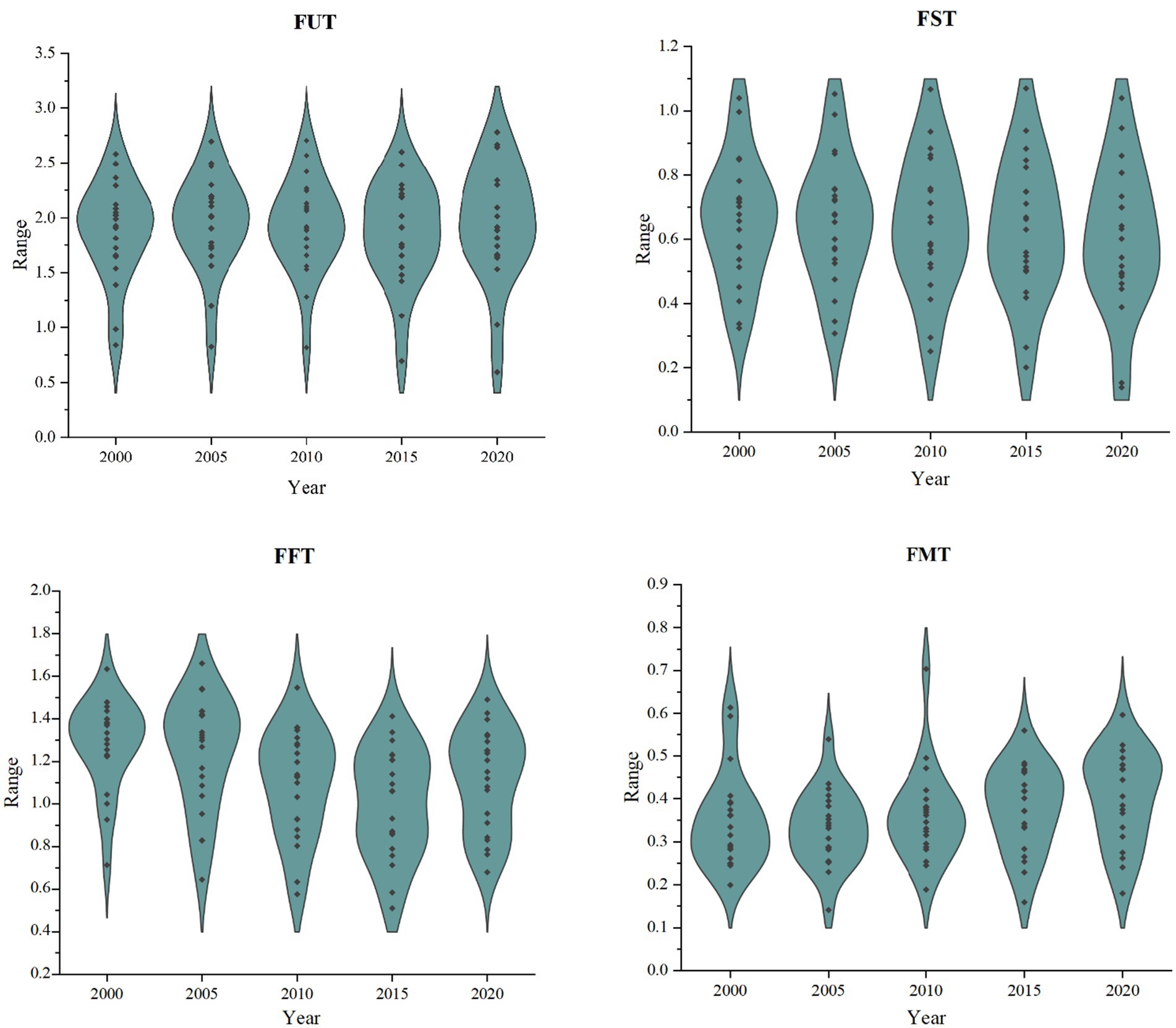 Despite a slight decline observed between 2005 and 2015, the FUT index of DLR has demonstrated an overall fluctuating upward trend. Figure 5 illustrates that the FUT index values for the years 2000, 2005 and 2010 are concentrated within the range of 1.5 to 2.5. The range of data concentration areas exhibited an expansion in 2015 and 2020, with a more pronounced expansion observed in the range of violin heads in 2020. This suggests a further widening of regional differences.