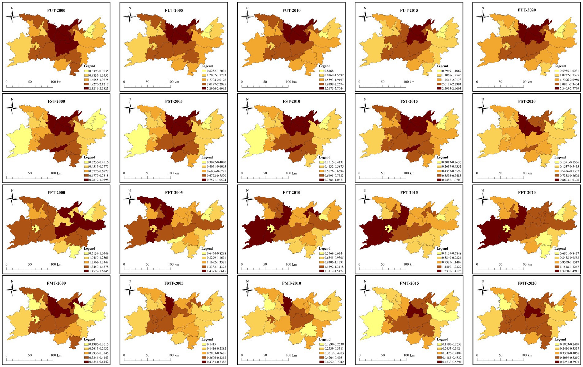 As illustrated in Figure 6, the spatial pattern of FUT exhibits a high concentration in the central region and a low concentration in the peripheral areas. The mean values for each year are 1.8829, 1.9521, 1.9196, 1.8634 and 1.9565, respectively. The regions with the highest values in 2000 include Wangcheng, Junshan, Huarong, Xiangyin, Miluo, Dingcheng, Anxiang, Hanshou, Lixian, Ziyang, Heshan, Nanxian and Yuanjiang. The counties in Junshan, Huarong, Xiangyin, Dingcheng, Anxiang, Hanshou, Lixian, Ziyang, Nanxian and Yuanjiang are all above average in 2020. From 2000 to 2010, Wuling exhibited the greatest rate of change in transition (10.08%), while Heshan exhibited the lowest rate of change in transition (0.22%). From 2010 to 2020, Yueyanglou exhibited the greatest rate of change in transition (27.08%), while Lixian exhibited the lowest rate of change in transition (0.54%).