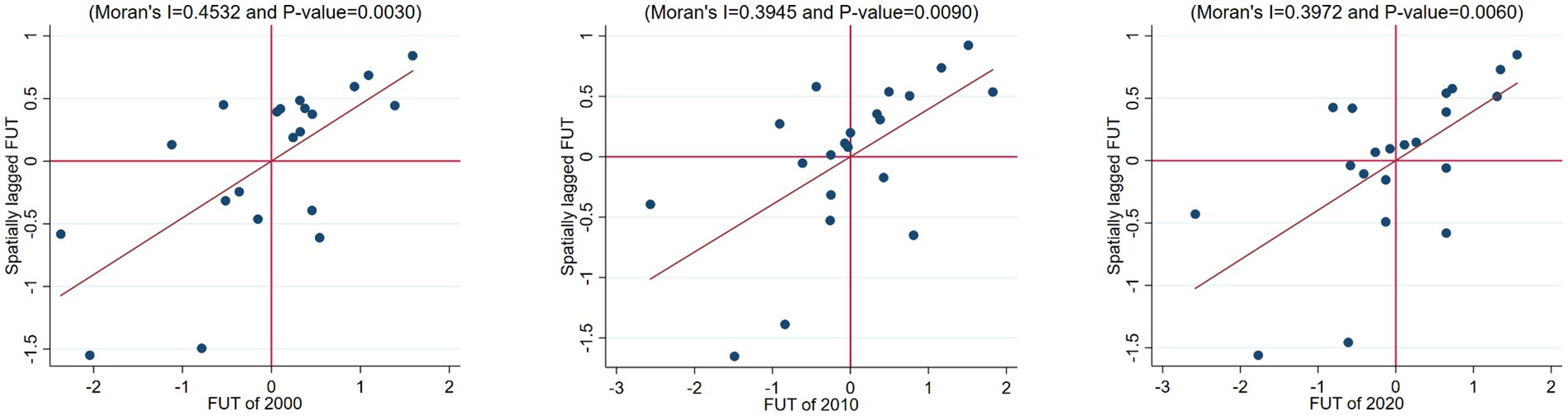 These findings illustrate that an increase in FUT within a local unit influences FUT in nearby areas. However, the selected explanatory variables in this study did not yield significant positive spatial spillover effect. The primary reason for this absence is the weak economic connections within the middle reaches of the Yangtze River, where the DLR is located. Factors such as over-concentration of economic factors and population growth act as major constraints to positive spatial linkages in the region (Xiao et al., 2021; Lee et al., 2024). Research has shown that the region must enhance interregional exchanges and cooperation to foster positive spatial linkages for interregional socio-economic development (Lv et al., 2023; Song et al., 2024). There remains untapped potential to bolster the generation of positive spatial spillover effect concerning political and socio-economic factors.