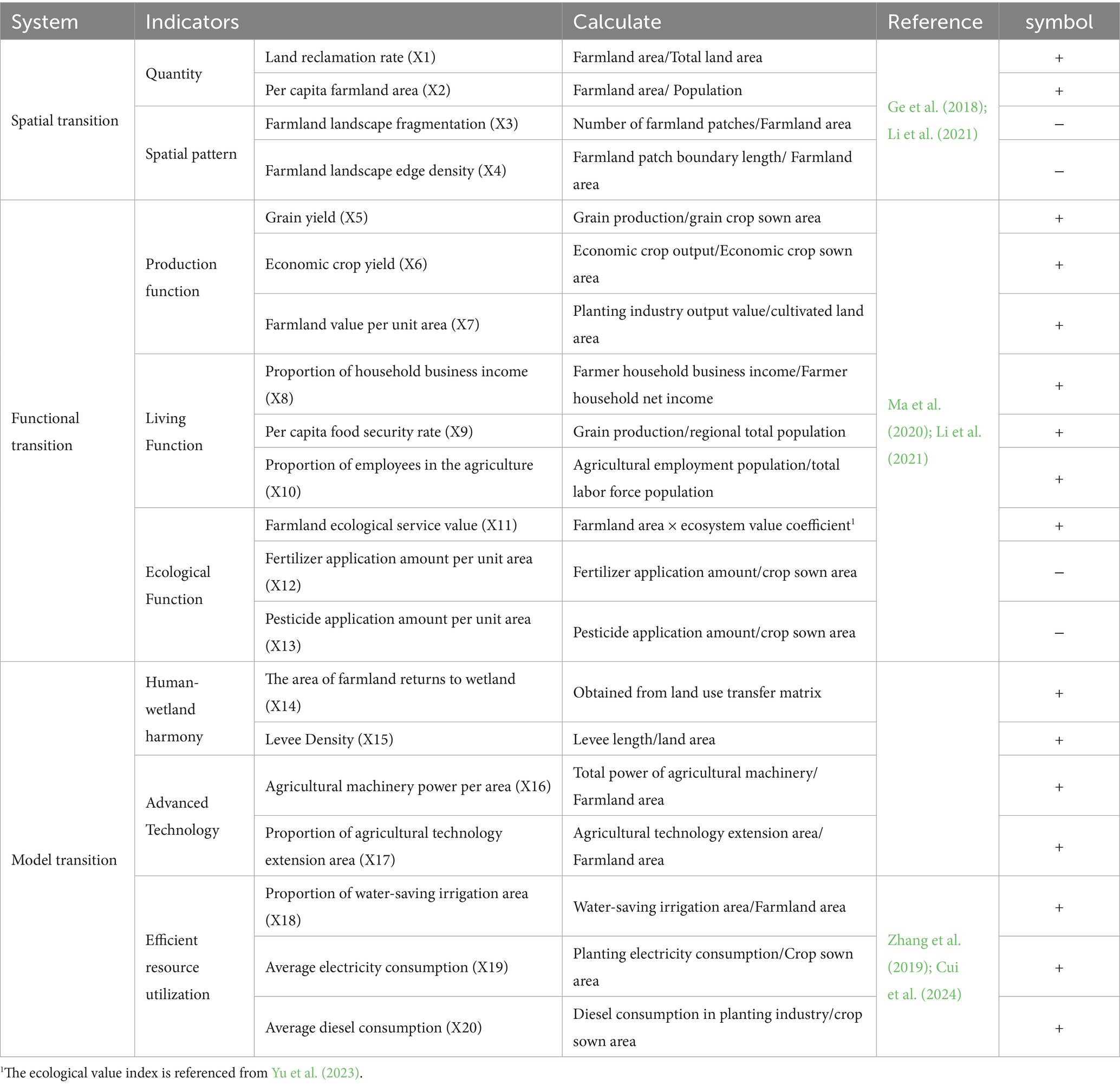 Building upon existing research (Ma et al., 2020; Ke et al., 2021; Cui et al., 2024), this paper divides FUT into spatial transition, functional transition and model transition. Spatial transition refers to changes in the quantity and spatial patterns of land use, while recessive morphology transition encompasses transitions in property rights, inputs, outputs, functions, quality, and management practices. Given that the function of farmland is the most direct reflection of recessive morphology, this paper uses function to analyze recessive morphology transition, examining it from three aspects: production, living, and ecological functions (Liang et al., 2020; Wang et al., 2024b). Model transition is defined as the transition of land use modes within the agricultural sector, it plays a pivotal role in facilitating FUT. A core aspect of model transition in the DLR is the integration of three critical components: human-wetland harmony, advanced technologies, and efficient resource utilization. The concepts of spatial and functional transitions are well-established, the following section delves into the model transition.
