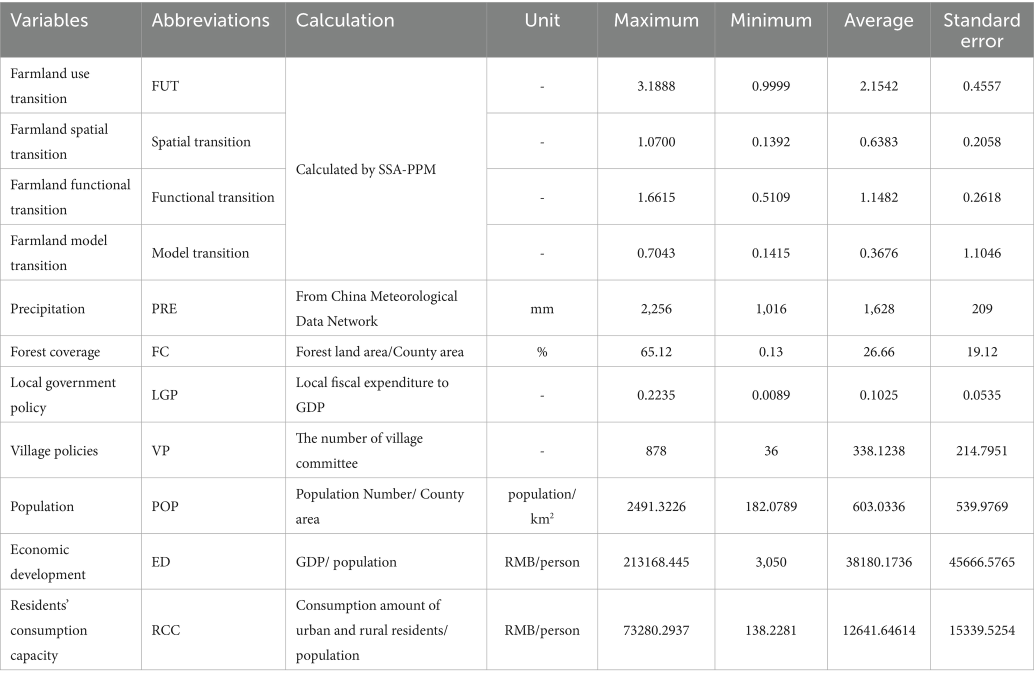 The land use data used in this study were obtained from the 30 m × 30 m remote sensing data for China’s land use, covering the years 2000, 2005, 2010, 2015, and 2020. This data was provided by the Data Center for Resources and Environmental Sciences of the Chinese Academy of Sciences.1 The dataset exhibits an accuracy rate of more than 93% for first-level land use categories and over 90% for second-level land use categories. Precipitation data is acquired from the China Meteorological Data Network.2 The Statistical Yearbook of Hunan Province and the Statistical Yearbook of Rural Areas in Hunan Province are the sources used to obtain other socioeconomic data for this study. Table 2 shows the descriptive statistics of the data.