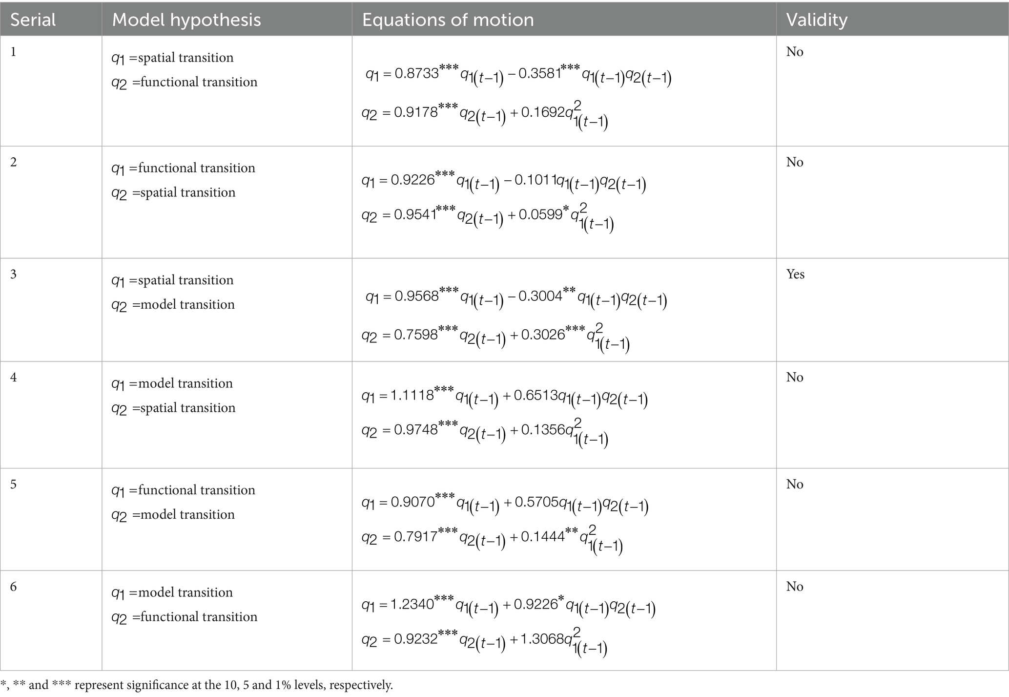 As can be seen in Table 3, spatial transition is the ordinal covariate of model transition among the drivers of FUT. , , it indicates that spatial transition and model transition establish negative feedback mechanisms that facilitate their orderly evolution, and that the degree of order is decreasing. , , it leads to the conclusion that spatial transition is an inhibitor of model transition, whereas model transition is a stimulant of spatial transition. Meanwhile, neither the spatial transition and functional transition nor the functional transition and model transition exhibit co-evolutionary mechanisms, indicating a state of disorder.