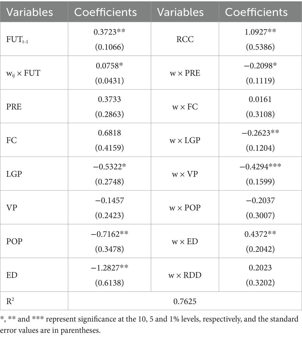 This study employes LM tests, Robust LM tests, and LR tests to determine the appropriate form of spatial econometric model (Results omitted). The results of the LM and Robust LM tests show that the Spatial Durbin model performs better than both the Spatial Error model and the Spatial Lag model. The LR test indicates that this study should adopt the spatial Durbin model with spatial fixed effects. The results in Table 4 show that the coefficient of the time lagged variable FUTt-1 is positive and statistically significant at the 5% confidence level, indicating a significant impact of previous social and economic development on current land use transition. The coefficient of the spatial lag term wij × FUT is positive and statistically significant at the 10% confidence level. An increase in FUT levels in neighboring areas also leads to higher FUT levels in the local area, consistent with the conclusions drawn from the global spatial autocorrelation analysis.