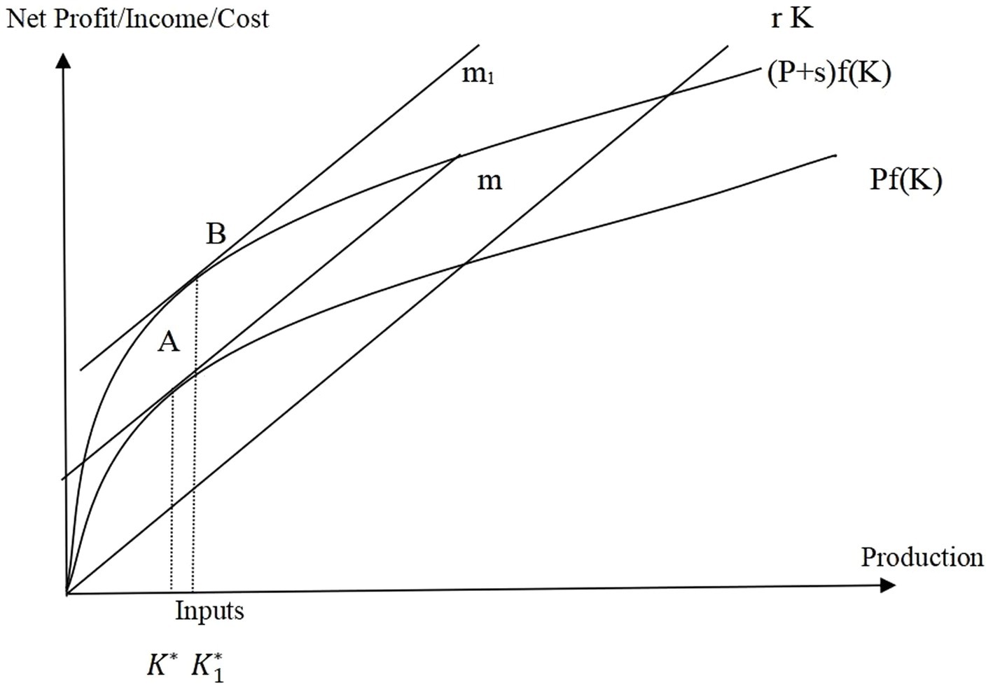 In the context of the neoclassical growth model, the optimal decision-making model for input production by agricultural producers can be described as. The key condition for agricultural producers to maximize their net revenue is the equality of marginal revenue and marginal cost which is described as . In other words, the tangent line ‘m’ of the cost function intersects the agricultural production income curve at point A, signifying the point at which agricultural producers can achieve maximum net revenue. At this point, the net income of agricultural producers can be maximized, corresponding to the optimal production inputs (). The maximum net income for agricultural producers is .