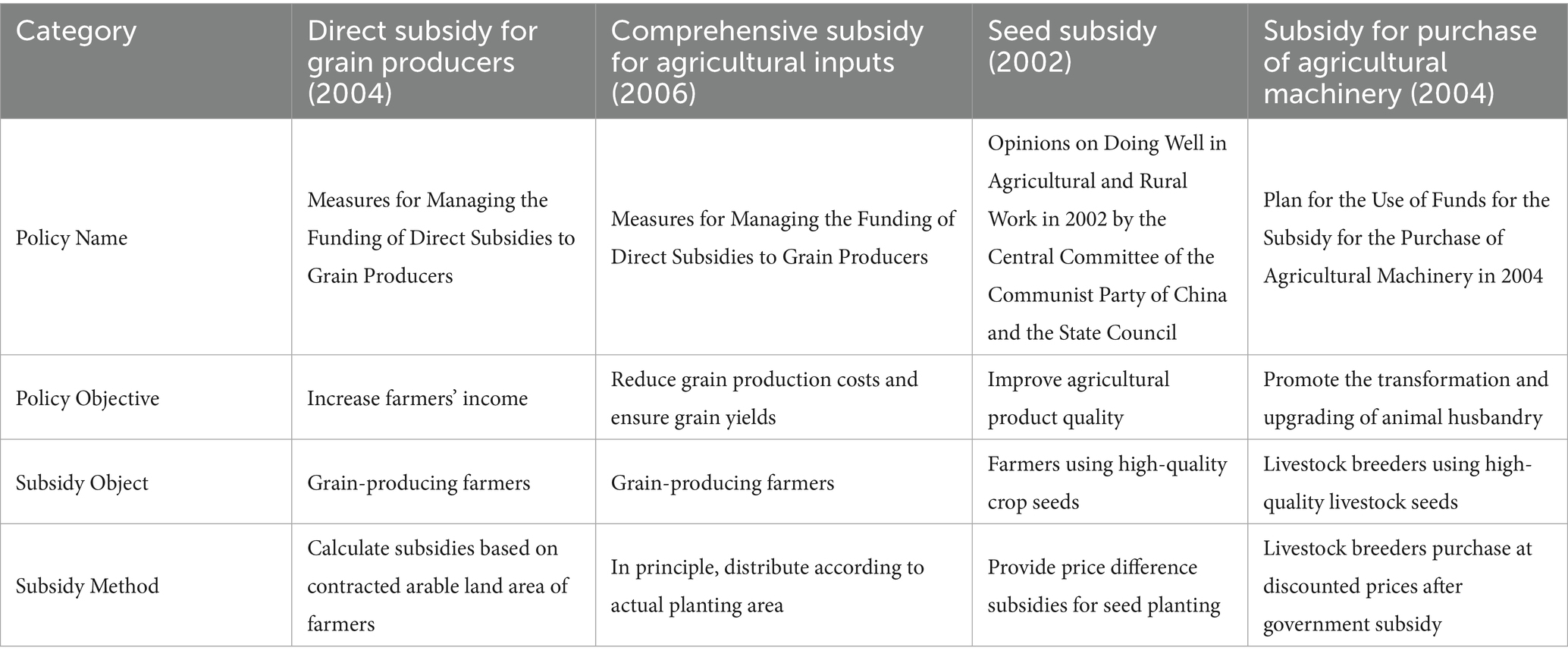 China transitioned from a grain price protection system to a grain direct subsidy system in 2001 to alleviate the burden on farmers and enhance their motivation(Yang and Kong, 2020). Pilot reforms of the grain direct subsidy were initiated in major grain-producing regions such as Anhui and Jilin the following year. The nationwide implementation of the “grain direct subsidy” took place in 2004, with subsequent expansion in 2005 to encompass “three subsidies”: grain direct subsidy, agricultural machinery purchase subsidy, and improved seed subsidy. By 2006, China augmented the “three subsidies” with comprehensive subsidies for agricultural materials, establishing the “four subsidies” framework that included direct grain subsidies, comprehensive agricultural material subsidies, improved variety subsidies, and agricultural machinery and tool purchase subsidies(Gong and Li, 2022). In 2007, China introduced the agricultural insurance premium subsidy policy to mitigate economic losses from natural disasters and ensure the orderly progression of agricultural production. In 2015, China consolidated the direct grain subsidies, improved variety subsidies, and comprehensive agricultural material subsidies into agricultural support and protection subsidies under the “three subsidies” pilot reform, with a specific focus on endorsing large-scale farmers in agriculture to uphold the principle of prioritizing subsidies for those who contribute significantly to food production(Yang et al., 2022).