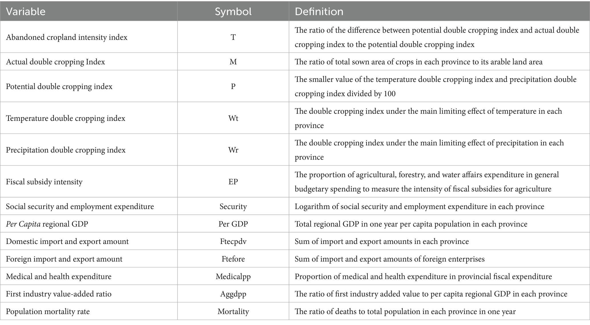 Firstly, social security and employment expenditure encompassing pension, unemployment benefits, social assistance, vocational training, and minimum living support reflect fiscal outlays on social security and employment. This aims to enhance the social security system, boost employment opportunities, mitigate social tensions, and stabilize societal progress. Zhang (2021) contends that enhancing the rural social security system can effectively rejuvenate the labor force, protect workers’ interests comprehensively, and bolster their engagement in agricultural activities. Secondly, per capita GDP serves as a pivotal indicator of economic development and living standards within a region. A higher per capita GDP signifies more advanced economic growth and elevated living standards for residents. Jiang et al. (2022) posit that regions with heightened economic development and urbanization rates possess a solid foundation for ensuring the adequate supply of grains and essential agricultural products, potentially mitigating issues related to abandoned farmland. Thirdly, the import–export volume of a province plays a pivotal role in the context of economic globalization, facilitating increased international trade activities. This phenomenon broadens China’s agricultural trade market, showcases domestic agricultural comparative advantages, and attracts foreign capital investments. Chen (2017) argues that direct foreign capital inflows can offer financial backing for agricultural research and production in China, bridging gaps in research and development funding, fostering capital accumulation, promoting technological innovation, and thereby reducing instances of abandoned farmland. Fourthly, the import–export volume of foreign-funded enterprises within a region over a specific period reflects the region’s economic development level, international competitiveness, and appeal to foreign investments. Zhang and Xu (2025) assert that a higher import–export volume indicates a broader sales market and increased demand for agricultural products, enabling farmers to reap greater benefits from foreign trade and effectively curbing farmland abandonment. Fifthly, government expenditure on medical and healthcare services encompasses various aspects of the healthcare sector crucial for people’s daily lives, serving as a vital pillar for ensuring healthy living conditions. Fan et al. (2024) argue that higher spending on medical and healthcare services signifies more comprehensive basic public services within a region. Improved access to medical assistance for rural residents can enhance agricultural productivity. Lastly, the population mortality rate, calculated as the ratio of deaths within a region in a year to the average total population during that period, is a key indicator of living standards and health conditions in different regions. This metric reflects the quality of life and labor force dynamics within a region. Chen et al. (2025) suggest that a lower population mortality rate indicates better health conditions among the population, resulting in a larger available labor force for production and living. In rural areas, where many elderly individuals continue farming, this may lead to a reduction in farmland abandonment.