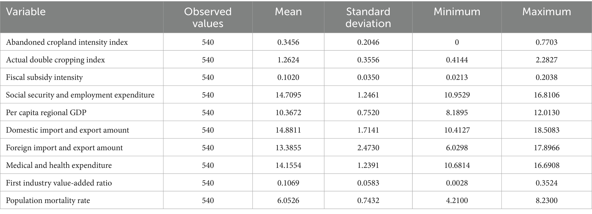 The study utilizes panel data from 30 provinces spanning the years 2003 to 2020, excluding the Tibet Autonomous Region due to significant missing data. This time frame was selected to coincide with China’s implementation of fiscal subsidies for agricultural development and substantial changes in cultivated land, providing a more precise analysis of farmland abandonment trends. Data sources include the China Statistical Yearbook and provincial statistical yearbooks. Descriptive statistics for the variables are presented in Table 3 based on the detailed data analysis.