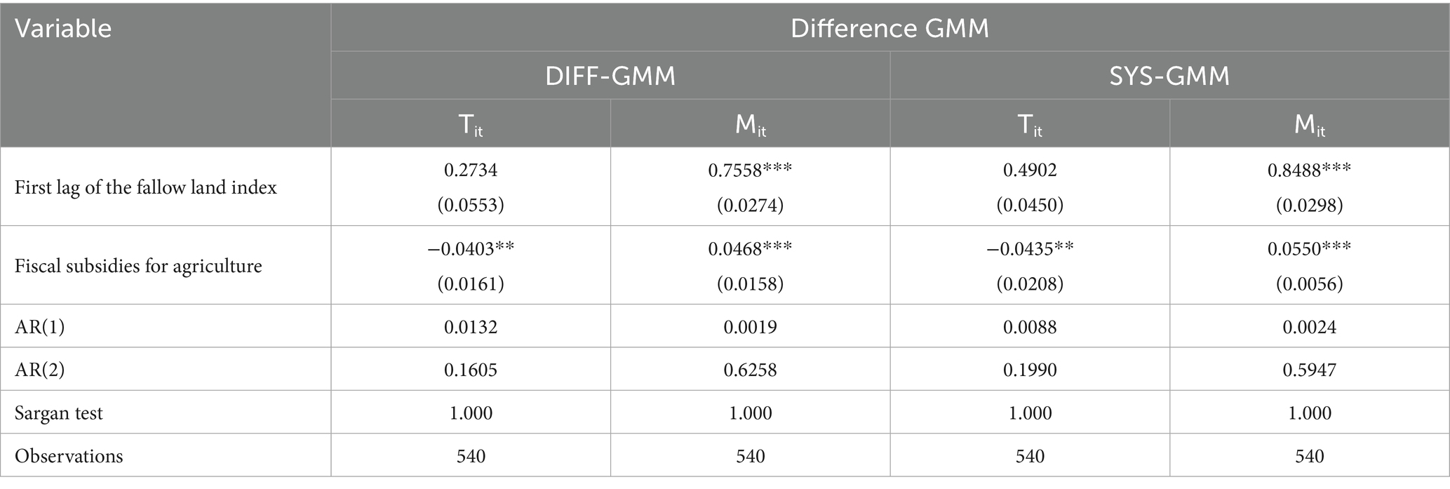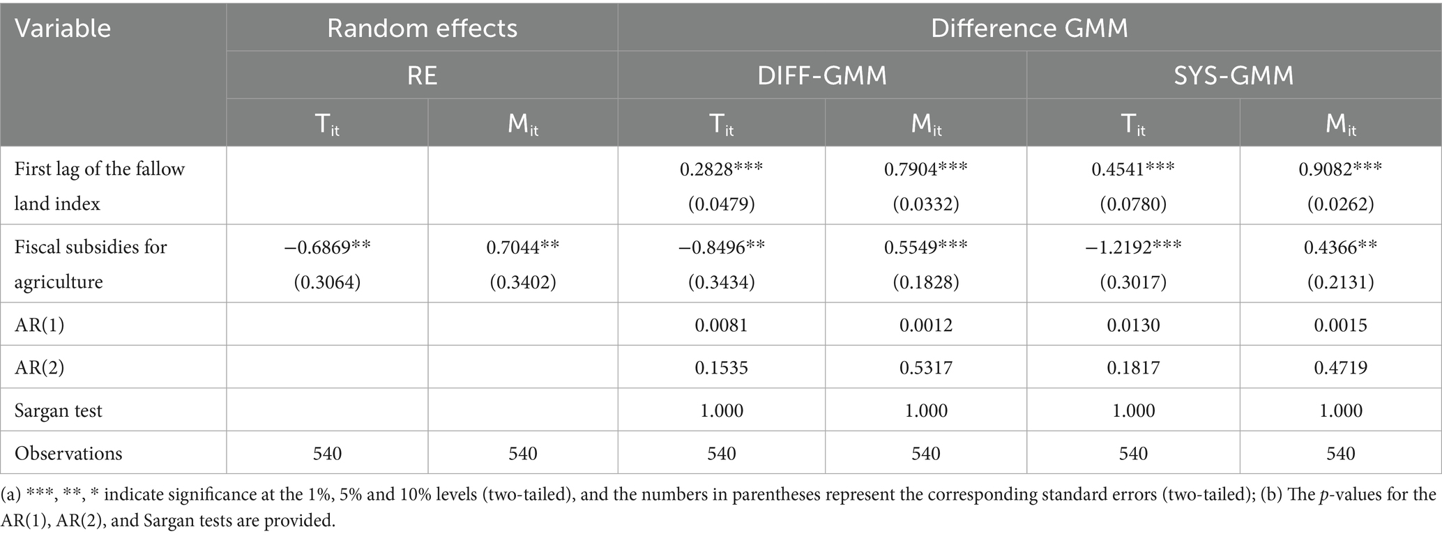 Herein, Ti,t–1 in Equation 3 and Mi,t–1 in Equation 4 represent the first-order lag terms of the farmland abandonment intensity index and the actual multiple cropping index, respectively, while the control variables align with Equations 1, 2.