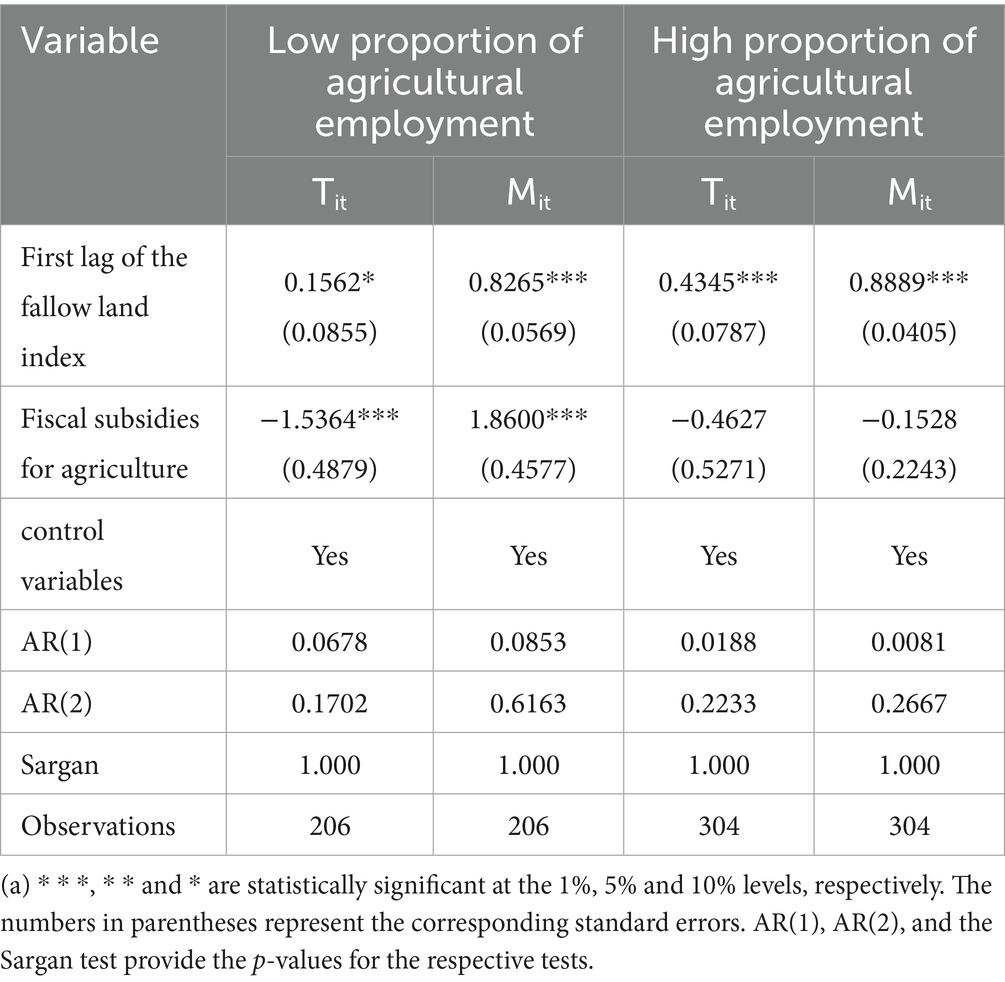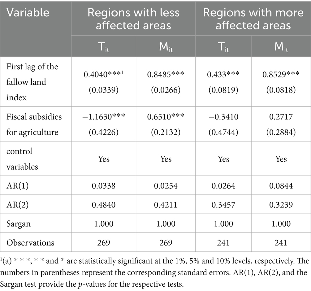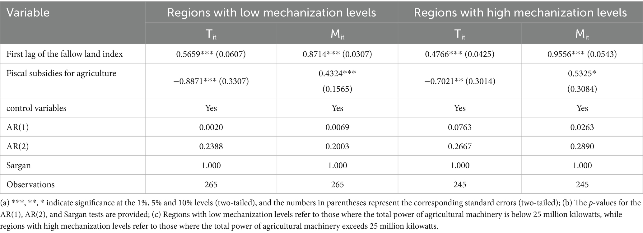 Enhancing agricultural mechanization can boost production efficiency, mitigate labor shortages, and reduce cultivated land abandonment(Hong et al., 2022). Based on the actual impact of agricultural mechanization levels on farmland abandonment, this study stratifies the sample based on the national average total power of agricultural machinery into two subsets: one exceeding the average and the other falling below it. This division aims to explore variations in the effects of fiscal subsidies on land abandonment in agriculture. The subset surpassing the average indicates a higher regional total power of agricultural machinery compared to the national average, while the subset below the average signifies a lower regional total power. This stratification enhances our comprehension and examination of the national distribution of agricultural machinery power and regional disparities. Analyzing these subsets facilitates a comprehensive understanding of regional agricultural machinery power levels and mechanization progress. The estimation results of the system GMM are shown in Table 6.
