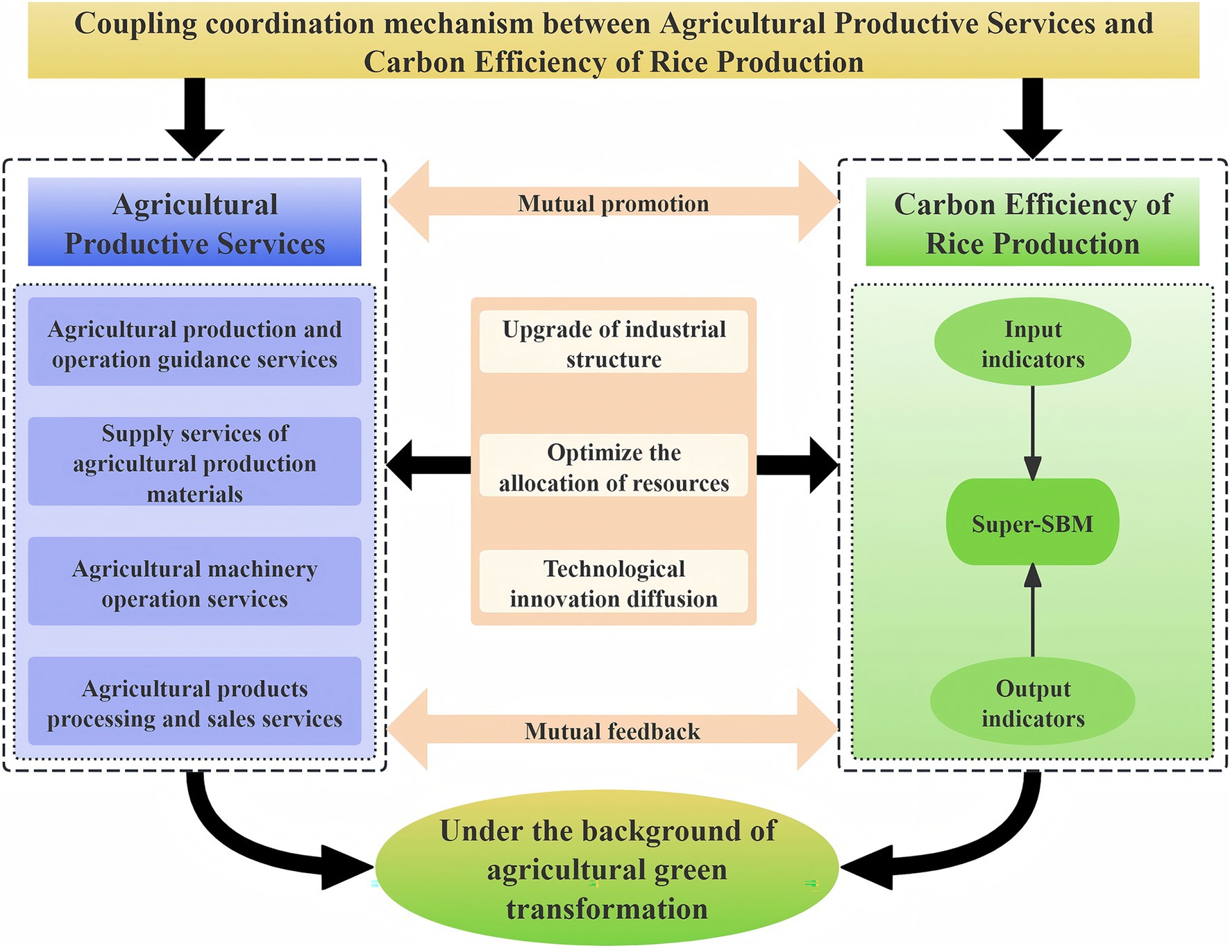 The development of agricultural productive services (APS) is a critical component of agricultural modernization. It offers innovative pathways to transform conventional farming practices and accelerate green transitions in agriculture (Geng et al., 2024; Shi et al., 2024). Its strategic implementation is significant for optimizing rice production systems—transitioning cultivation paradigms, and enhancing productivity (Li and Li, 2020; Wu et al., 2024). Functionally, APS is a pivotal mechanism to reform extensive agricultural management models and advance low-carbon transitions. Addressing inefficiencies inherent in fragmented smallholder operations—such as suboptimal factor allocation and low productivity—systematically resolves structural bottlenecks in traditional farming systems (He et al., 2023; Huan et al., 2022) Furthermore, APS permeates entire agricultural value chains, with outsourcing service providers incentivized to adopt low-carbon practices across production stages. This characteristic enables APS to simultaneously mitigate ecosystem imbalances, improve resource-use efficiency, and reduce environmental costs (Xu et al., 2024; Yang et al., 2024). Consequently, the evolution of APS and the restructuring of agricultural production systems are inextricably linked during green transformation processes, necessitating integrated policy design that synchronizes both dimensions (Qiu et al., 2022). Given this context, establishing a synergistic development framework that harmonizes APS with the carbon efficiency of rice production (RCE) becomes imperative. Such integration safeguards national food security and creates dual-win scenarios for sustainable agricultural development, bearing substantial theoretical and practical relevance.