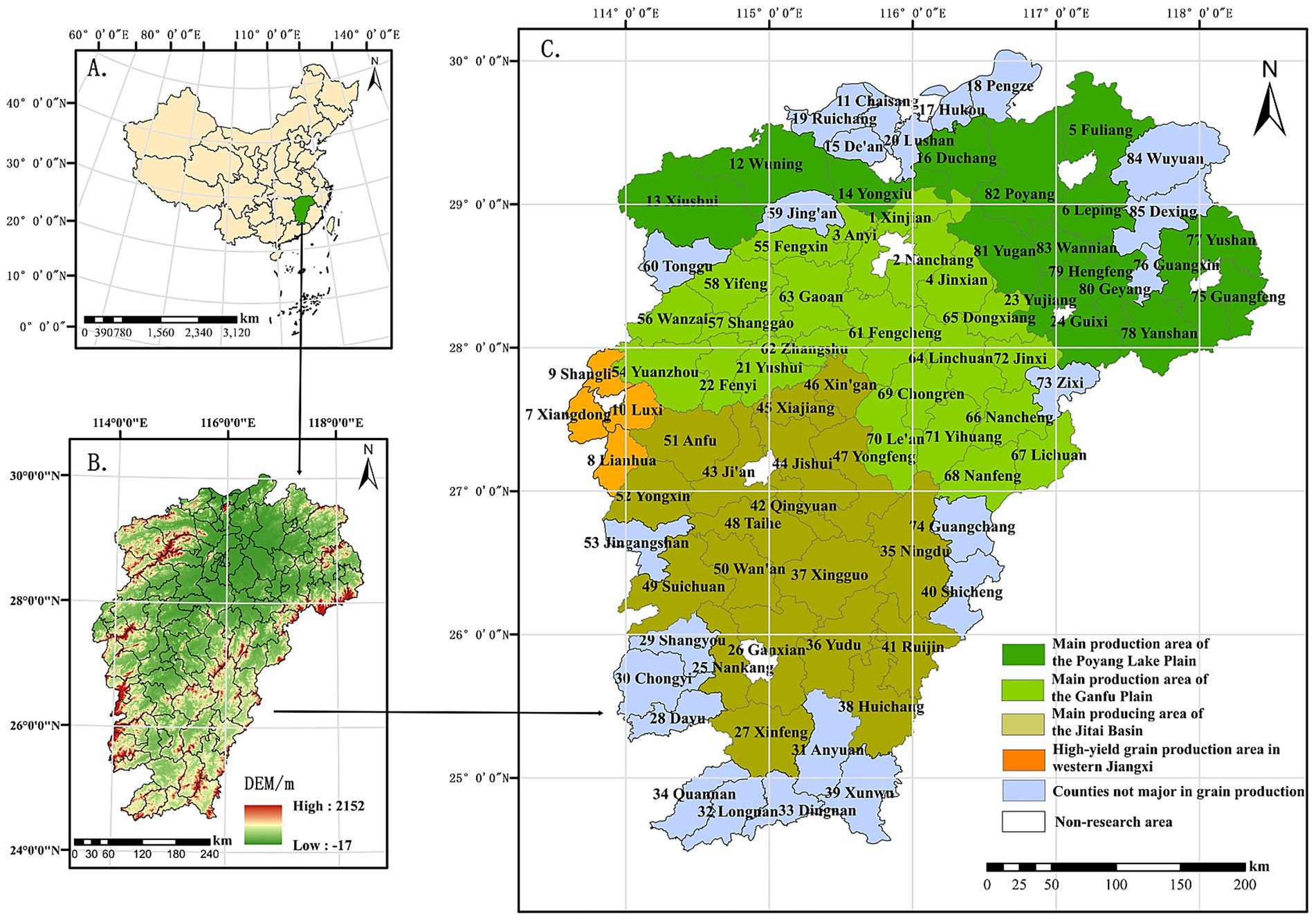 Jiangxi Province, situated in southeastern China (24°29′14″–30°04′43″N, 113°34′18″–118°28′56″E), occupies the southern bank of the middle-lower Yangtze River (Figure 2A). Its topography is predominantly characterized by mountainous (36%) and hilly (42%) terrains, forming a north-opening basin surrounded by eastern, southern, and western peripheral ranges with alluvial plains in the central-northern region (Figure 2B). It should be noted that the elevation data presented in Figure 2B was obtained from the China Geospatial Data Cloud Platform. Negative elevation values are referenced to mean sea level, with their absolute magnitudes indicating the vertical distance between ground surface points and the reference datum. Under a subtropical monsoon climate regime, the province hosts four primary grain production zones: Poyang Lake Plain, Ganfu Plain, Jitai Basin, and western Jiangxi region (Figure 2C). As one of China’s 13 major grain-producing provinces, Jiangxi holds a national high typical and representative nationwide in rice cultivation, consistently ranking third in paddy output and playing a pivotal role in safeguarding national food security (Liang et al., 2024). Notably, Jiangxi was among the first provinces to implement nationwide pilot programs for comprehensive agricultural socialized services in 2013. Multiple counties have since been designated as national APS demonstration zones, establishing institutional foundations for green agricultural transition and unlocking transformative potential in sustainable farming practices.