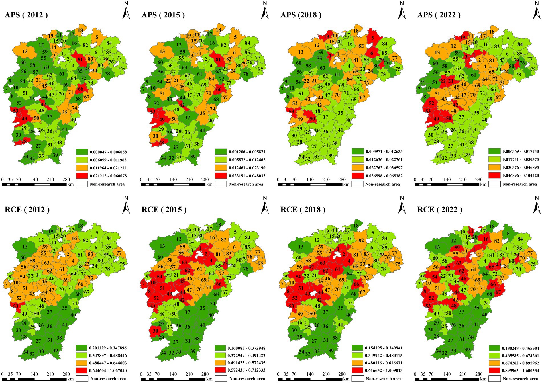 To investigate the spatiotemporal patterns and evolutionary trajectories of APS and RCE across Jiangxi’s counties, we conducted quartile-based classification using the natural breaks method in ArcGIS 10.8. The county-level APS and RCE metrics for 2012, 2015, 2018, and 2022 were systematically categorized into four tiers, as visualized in Figure 3. For cartographic clarity and space optimization, county identifiers in the maps are represented numerically, with corresponding geographical labels cross-referenced to Figure 2 This standardized visualization protocol ensures consistent spatial referencing throughout the analysis.