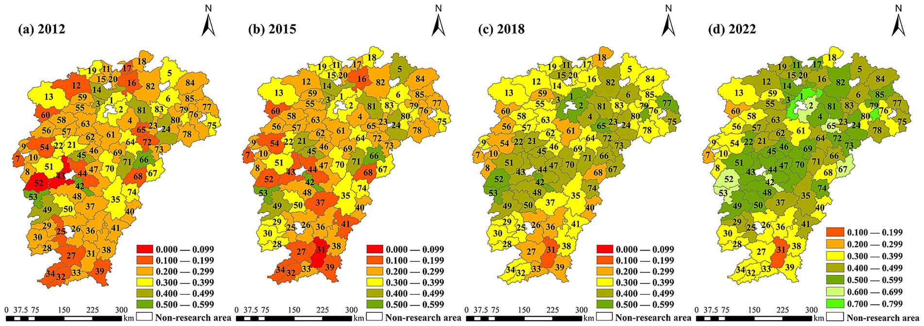 To visualize the spatial evolution of APS-RCE coupling coordination across Jiangxi’s counties, we conducted spatial mapping using ArcGIS 10.8 (Figure 4) based on coordination degree values from 2012, 2015, 2018, and 2022.