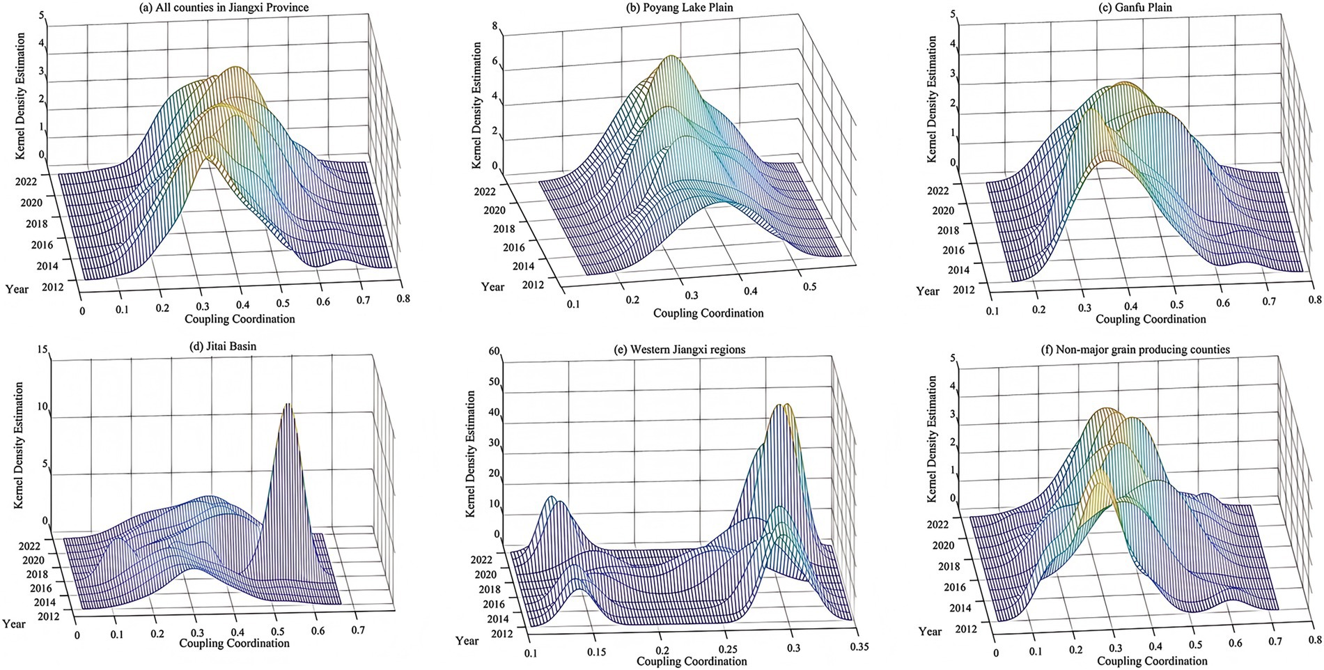 To comparatively analyze the dynamic evolutionary trends of APS-RCE coupling coordination across Jiangxi Province and its major grain production areas, we employed Kernel Density Estimation – a nonparametric technique particularly effective for identifying distributional characteristics and convergence patterns. The derived density curves were visualized using Origin 2022, enabling systematic analysis of spatial polarization or convergence tendencies in coordination development (Figure 5).