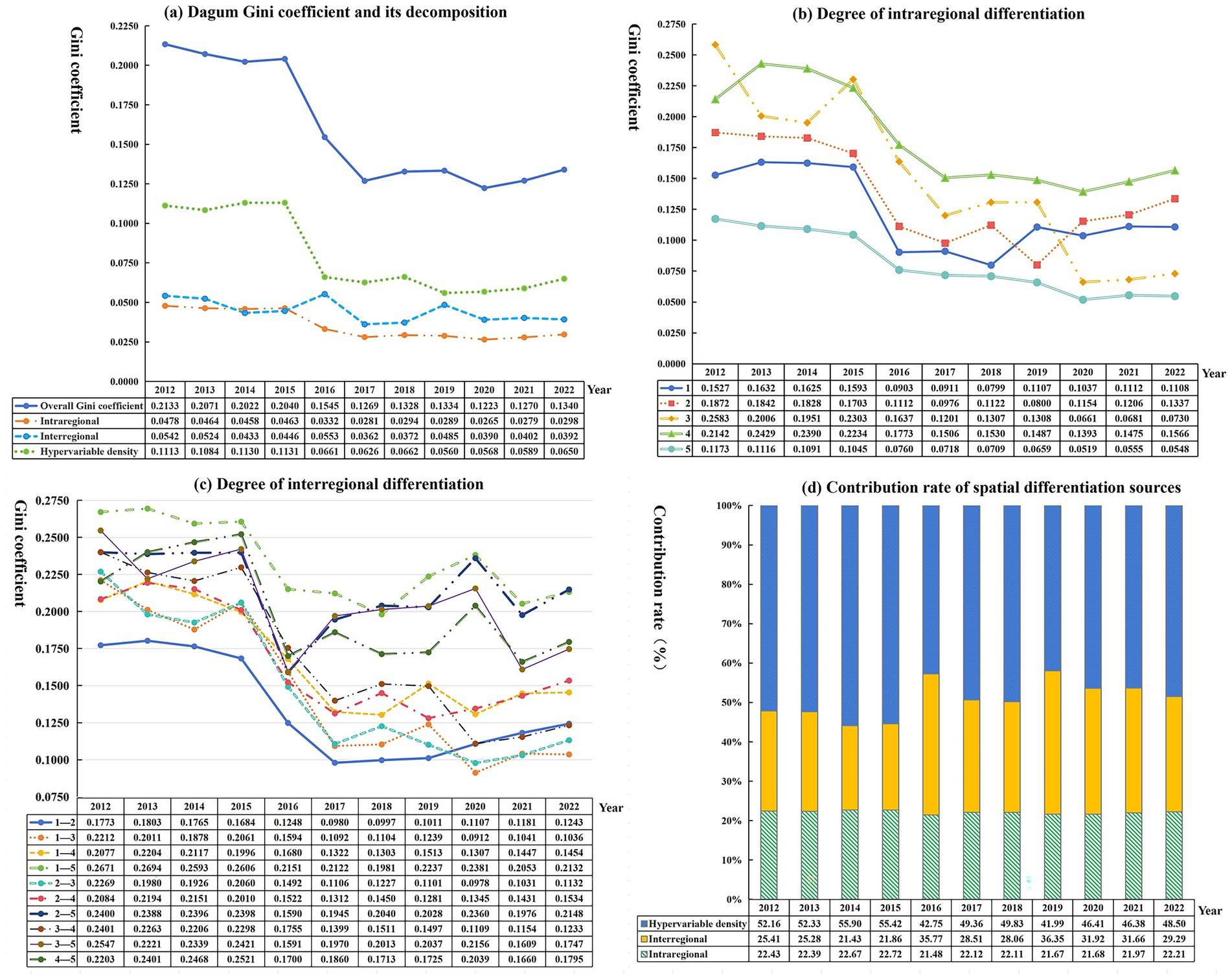 The study employed the Dagum decomposition method to quantify regional difference in CCD between APS and RCE across Jiangxi’s counties from 2012 to 2022, and the overall, intraregional and interregional Gini coefficients and contribution rates of CCD were measured by Matlab 2021 software (Figure 6).