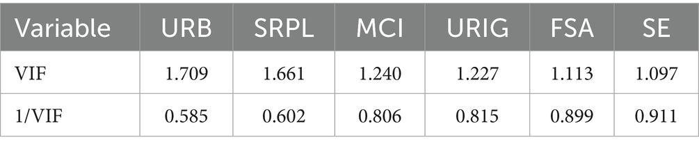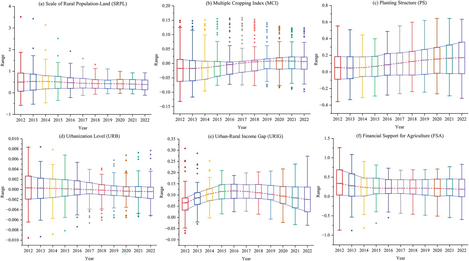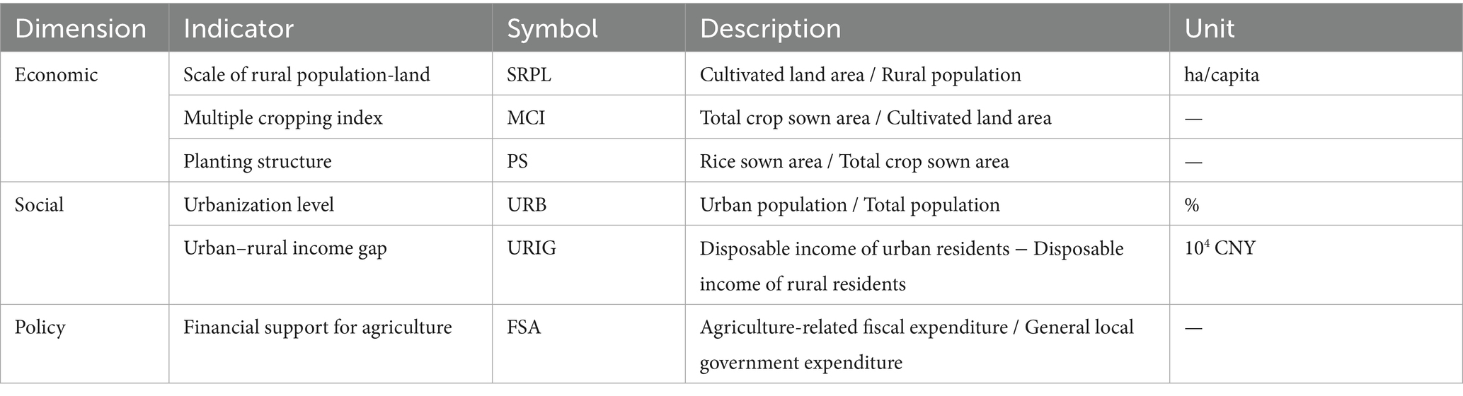 Current scholarship remains limited on factors influencing the interactive coordination mechanisms between APS and RCE. According to the mechanism analysis of coupling coordination and other correlation studies in the previous text, we operationalize the IPAT theoretical (York et al., 2003) framework to construct a multidimensional indicator system spanning economic, social, and policy dimensions. At the economic level, the main factors include the scale of rural population-land (SRPL), multiple cropping index (MCI), and planting structure (PS). The social level includes the urbanization level (URB) and the urban–rural income gap (URIG). The policy level is the financial support for agriculture (FSA). Therefore, the index system of CCD influencing factors was finally constructed based on six factors at three levels (Table 4).