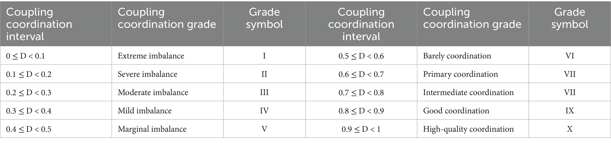 In Equations 5–6, T is the comprehensive coordination index of APS and RCE, α and β are undetermined coefficients, which are assigned to 0.5. D is the CCD of APS and RCE, and the value range is [0, 1]. Referring to the existing literature (Sun et al., 2024), the actual measured CCD is divided into 10 grades by an equal interval division method (Table 1).