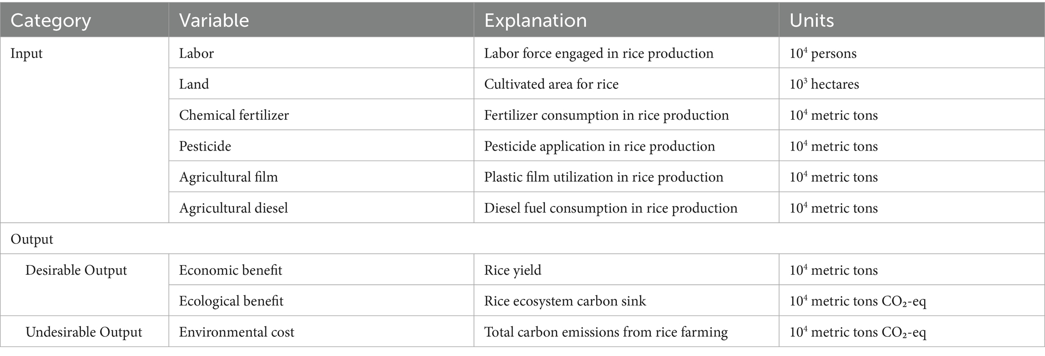 Under mounting pressures from tightening resource constraints, escalating non-point source pollution risks, and structural imbalances in ecosystems, traditional agricultural production models characterized by high inputs, high pollution, and low efficiency have become increasingly unsustainable and necessitate urgent improvements in carbon efficiency within agricultural systems—defined as achieving desired output growth while reducing redundant carbon emissions under given factor inputs (Bai et al., 2019; Zhu and Huo, 2022). As a critical metric for evaluating low-carbon agricultural performance, carbon efficiency holistically reflects the input–output relationship between agricultural resource utilization and carbon mitigation effects (Bajan and Mrówczyńska-Kamińska, 2020). While existing studies have measured and analyzed carbon efficiency in broad or narrow agriculture (Han et al., 2024; Liu and Yang, 2021; Yang et al., 2021) systematic assessments focusing on single staple crops—particularly their carbon efficiency dynamics—remain underexplored and warrant deeper investigation. In addition, rice cultivation is a major contributor to China’s agricultural carbon emissions (Shen et al., 2025; Song et al., 2023). Despite generating substantial emissions during production, rice ecosystems harbor significant carbon sequestration potential through plant biomass and soil organic carbon accumulation (Chen et al., 2021; Chen et al., 2022a, 2022b). Prevailing methodologies for constructing carbon efficiency evaluation systems, however, predominantly emphasize carbon sources within agricultural ecosystems while neglecting the quantifiable value of carbon sinks, resulting in fragmented and incomplete assessment frameworks. This study advances traditional carbon efficiency evaluation by integrating a “carbon reduction and sink enhancement” perspective to address this gap. Specifically, we distinguish rice carbon sinks as desirable outputs and carbon emissions as undesirable outputs, thereby establishing a more scientific and precise composite carbon efficiency index for rice production systems.