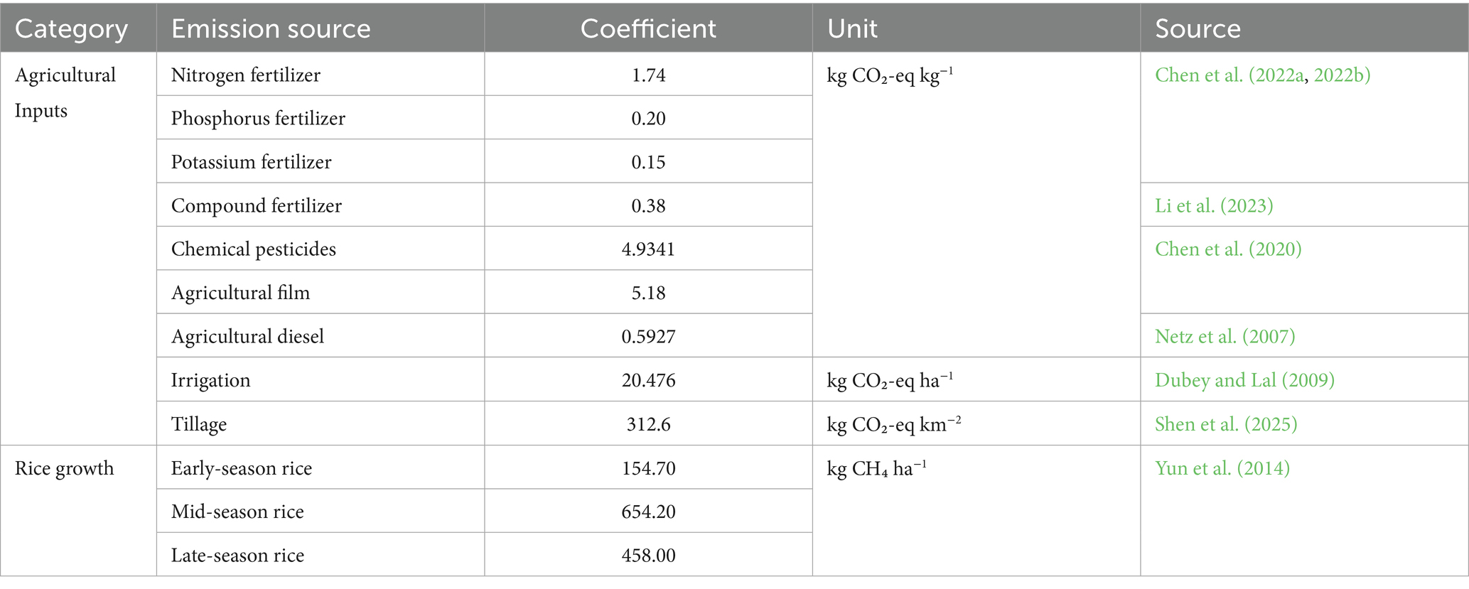2 Calculation of carbon emissions from rice cultivation. Total carbon emissions from rice production systems encompass direct and indirect carbon emission equivalents generated throughout the entire cultivation cycle, from field tillage to harvest. Drawing on established methodologies (Chen et al., 2022a, 2022b; Li et al., 2023; Wu et al., 2024), this study quantifies carbon emissions using the emission factor approach, addressing two primary sources: agricultural input utilization and rice growth processes. To account for data limitations in tillage area quantification, the actual sown area of rice is adopted as a proxy for tillage area. All other agricultural inputs are multiplied by coefficient B. The proposed model is formulated as follows: