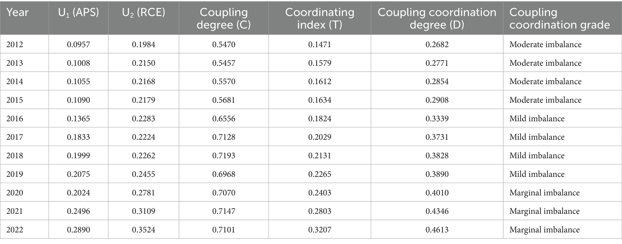 Firstly, from the development level of the two systems (U1 and U2), while APS consistently lagged behind RCE in absolute development levels, both systems demonstrated sustained upward trends. Secondly, in terms of coupling degree (C), the coupling degree exhibited a fluctuating upward trajectory, increasing from 0.5470 (2012) to 0.7101 (2022). These values remained within the high-coupling regime (C ≥ 0.7 after 2017), confirming strong bidirectional interactions between APS and RCE systems. Finally, from the perspective of CCD (D), the CCD progressed steadily from 0.2682 (2012) to 0.4613 (2022), transitioning through three distinct phases: moderate imbalance (2012–2015), mild imbalance (2016–2019), and marginal imbalance (2020–2022). Notably, although the development level of the CCD between the two systems shows an overall upward trend, the level is relatively low, indicating substantial untapped potential for APS-RCE synergy enhancement.